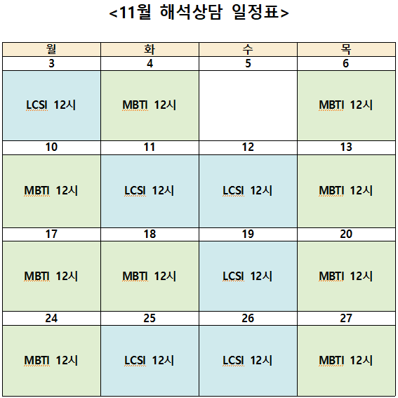 ○ 12월 심리검사 신청 일정은 11월 넷째주 월요일(11/17) 오후에 확인할 수 있습니다.