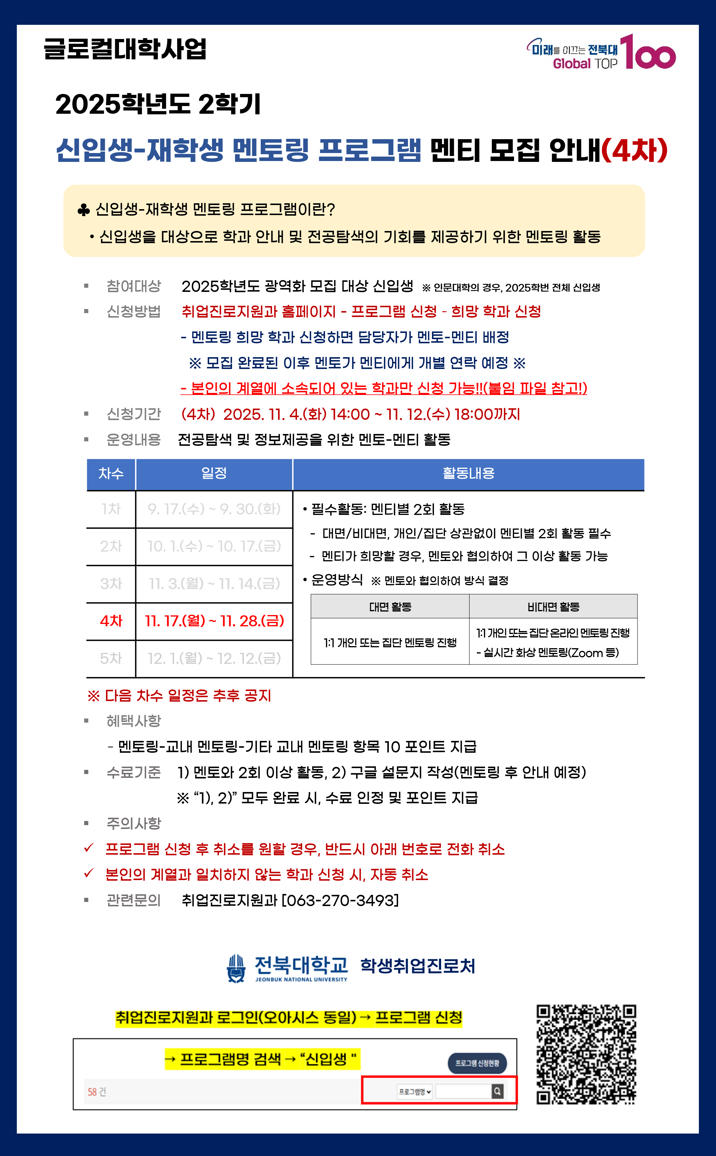→ 프로그램 → 프로그램 참가신청 → 멘토링 희망 학과 신청