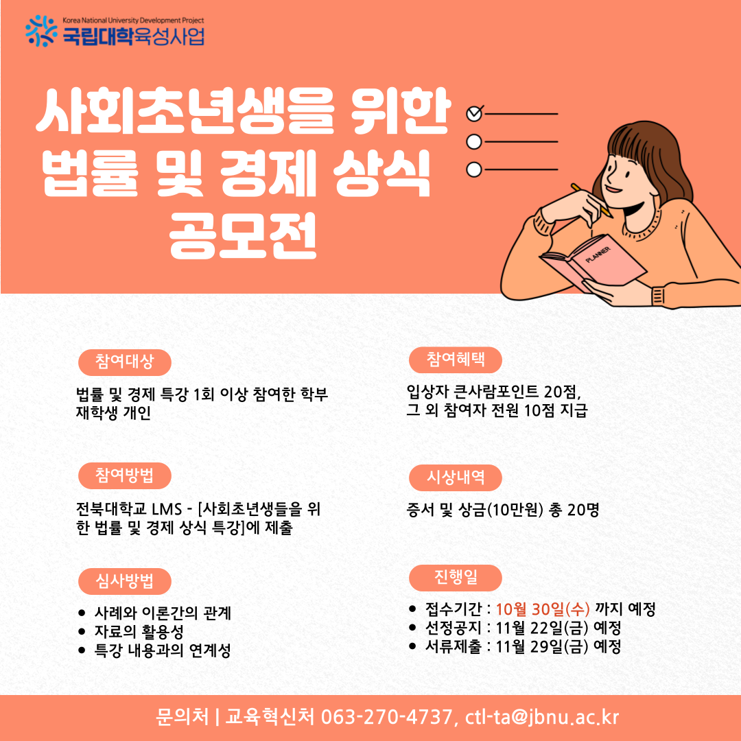 교육혁신처에서 사회초년생들을 위한 법률 및 경제 상식특강 참여자들을 대상으로 사례분석공모전을 진행하오니, 학생들의 참여를 바랍니다.