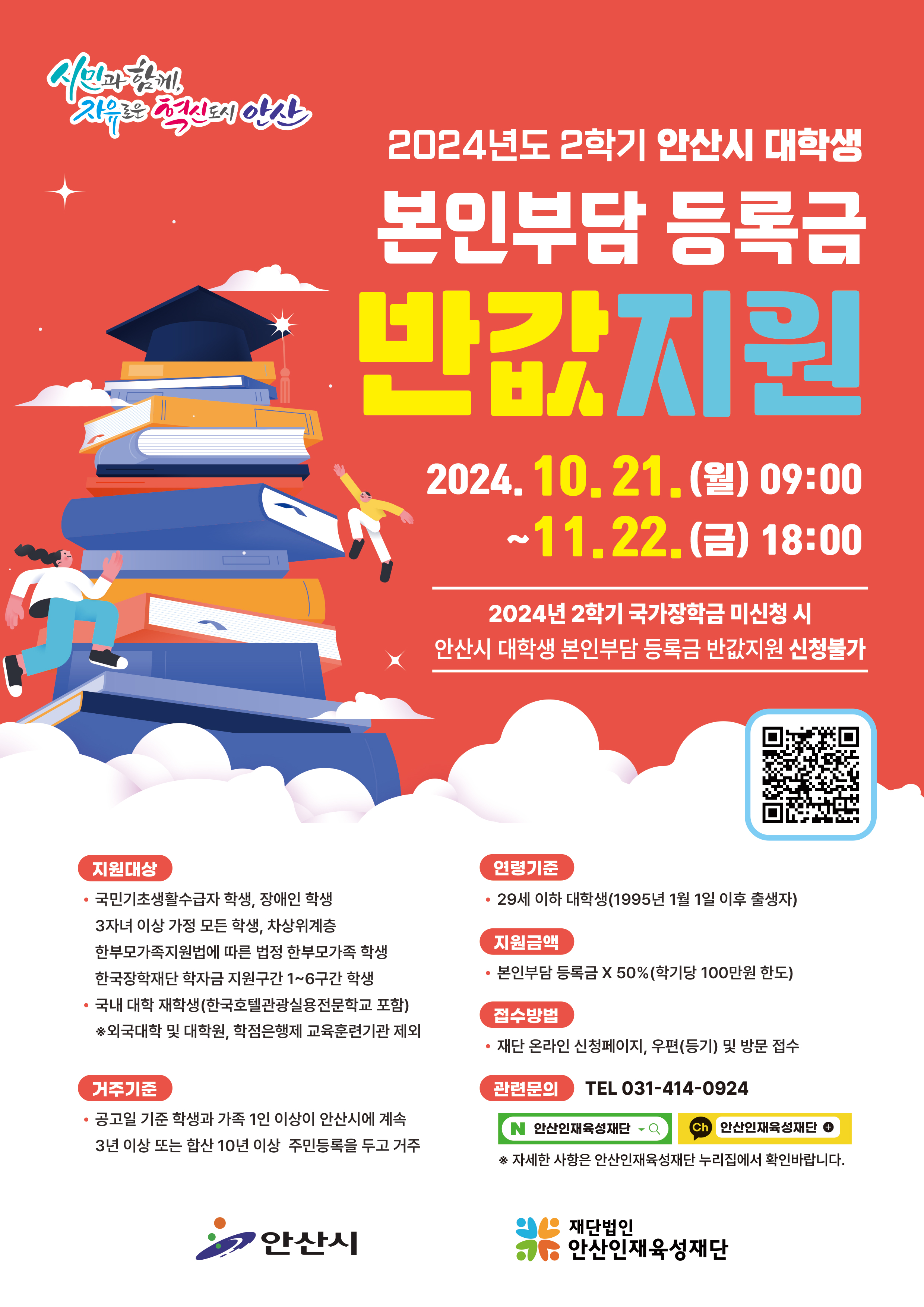 안산시에서 2024년 2학기 대학생 등록금 반값지원사업을 시행한다 하오니, 관심 있는 학생은 신청하여 지원 받으시기 바랍니다.