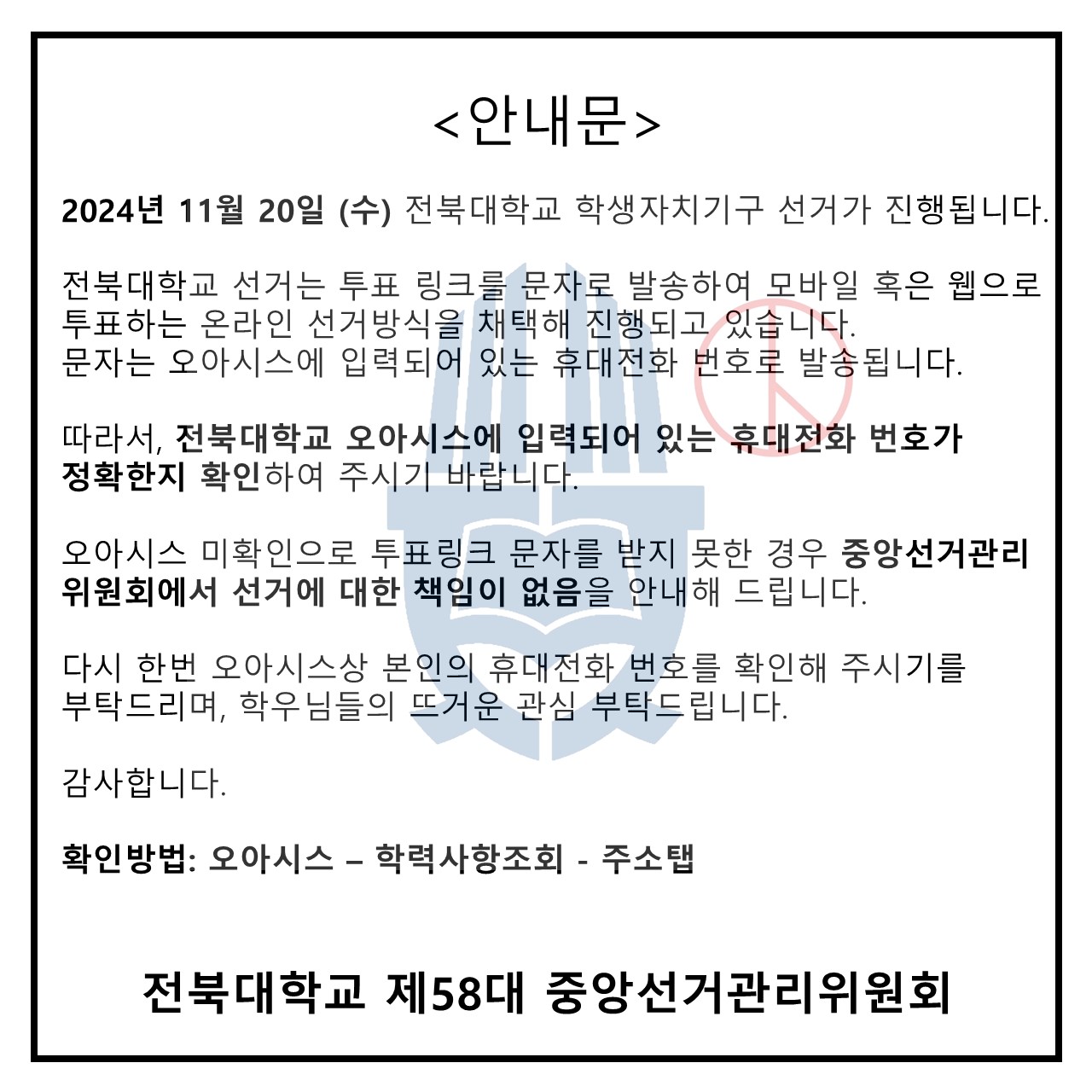2024년 11월 20일 (수) 전북대학교 학생자치기구 선거가 진행됩니다.