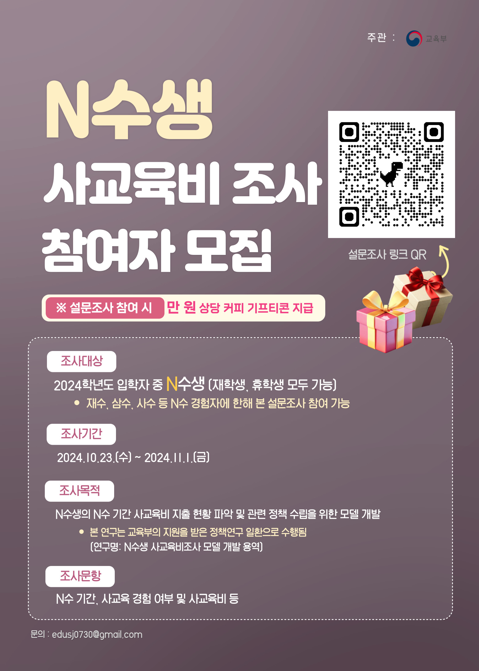 <N수생 사교육비 조사 참여자 모집> 설문조사를 실시하오니, 많은 참여 부탁드립니다.