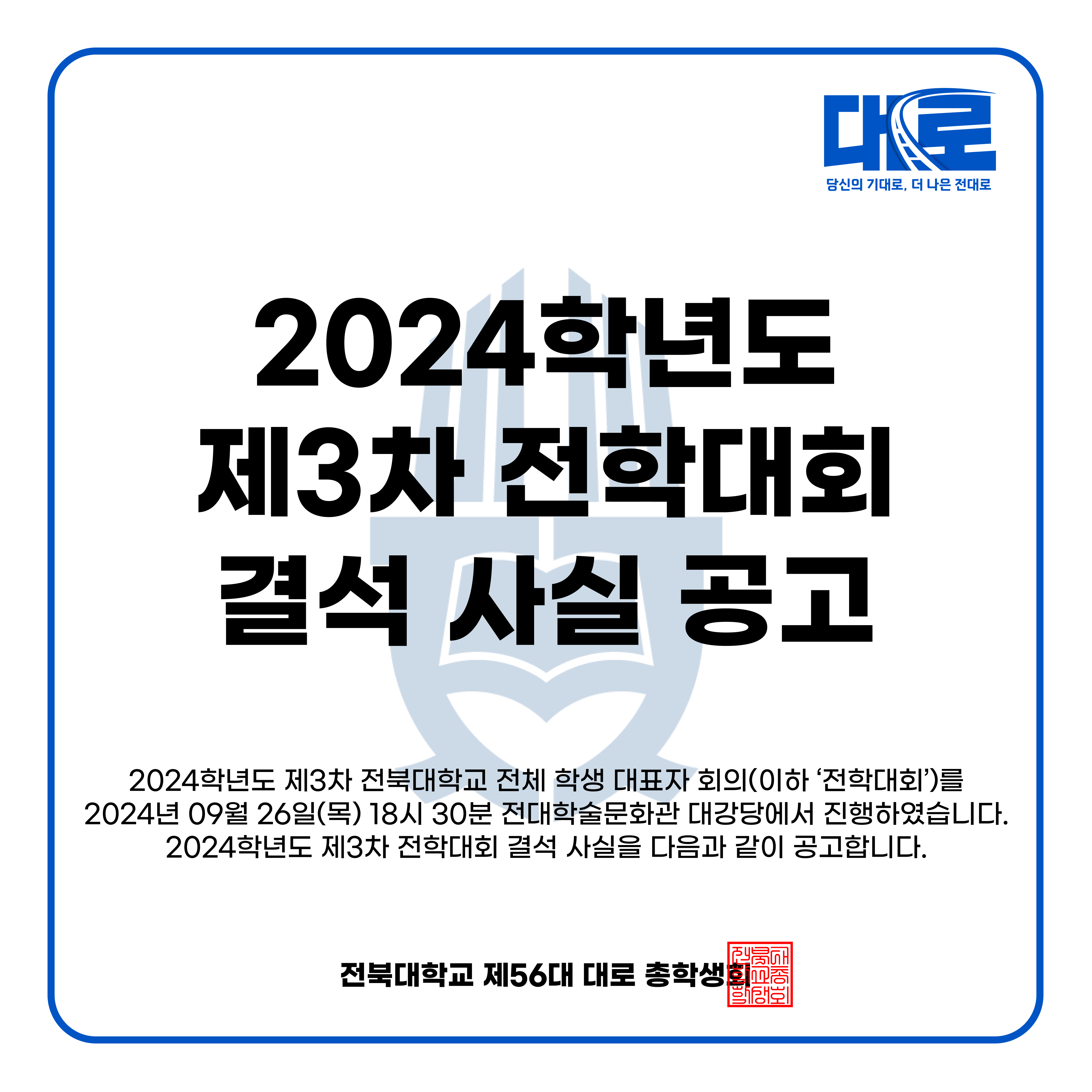 2024학년도 제3차 전북대학교 전체 학생 대표자 회의(이하 ‘전학대회’)를 2024년 09월 26일(목) 18시 30분 전대학술문화관 대강당에서 진행하였습니다. 2024학년도 제3차 전학대회 결석 사실을 다음과 같이 공고합니다.