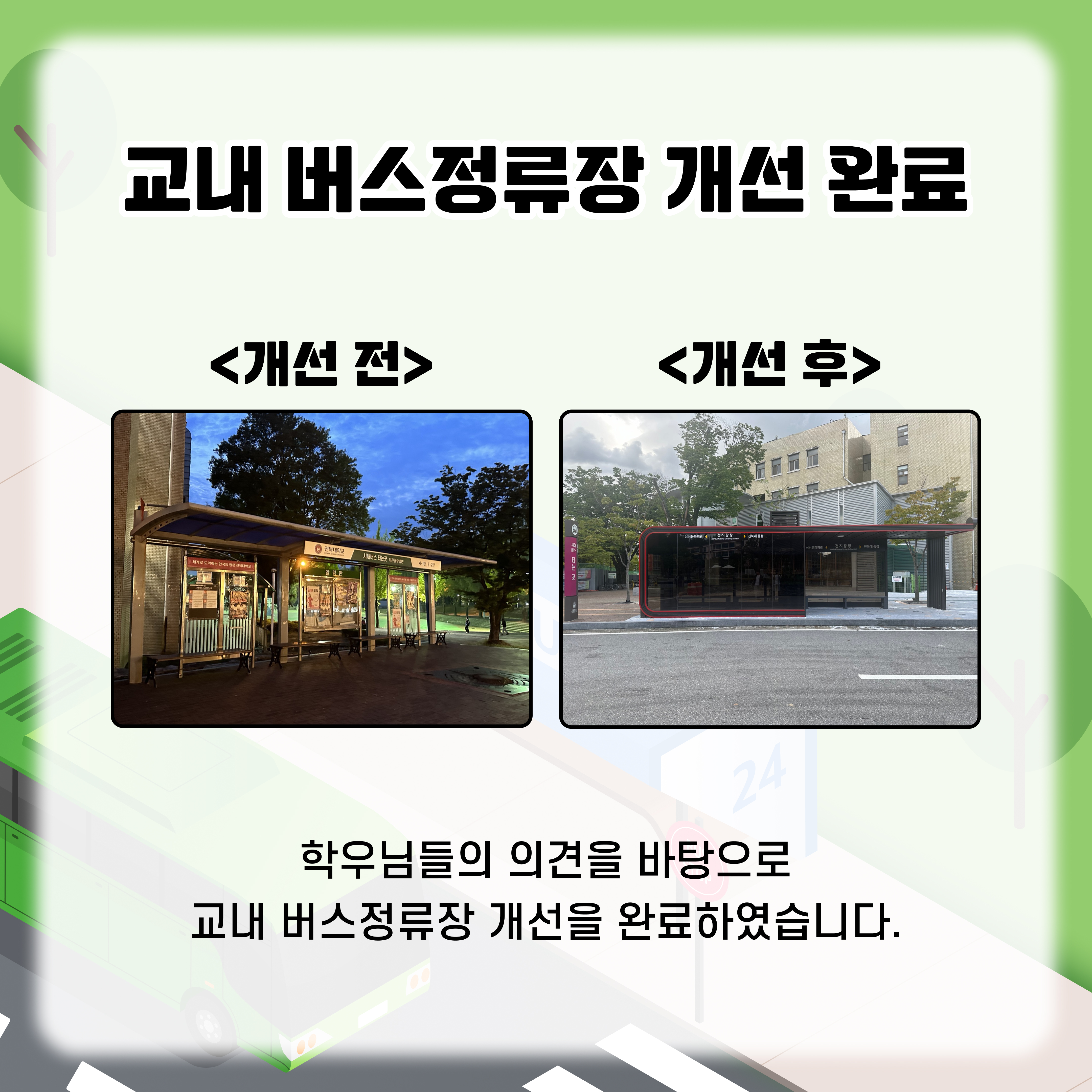 학우님들의 의견을 바탕으로 교내 버스정류장 개선이 완료되었음을 알립니다.