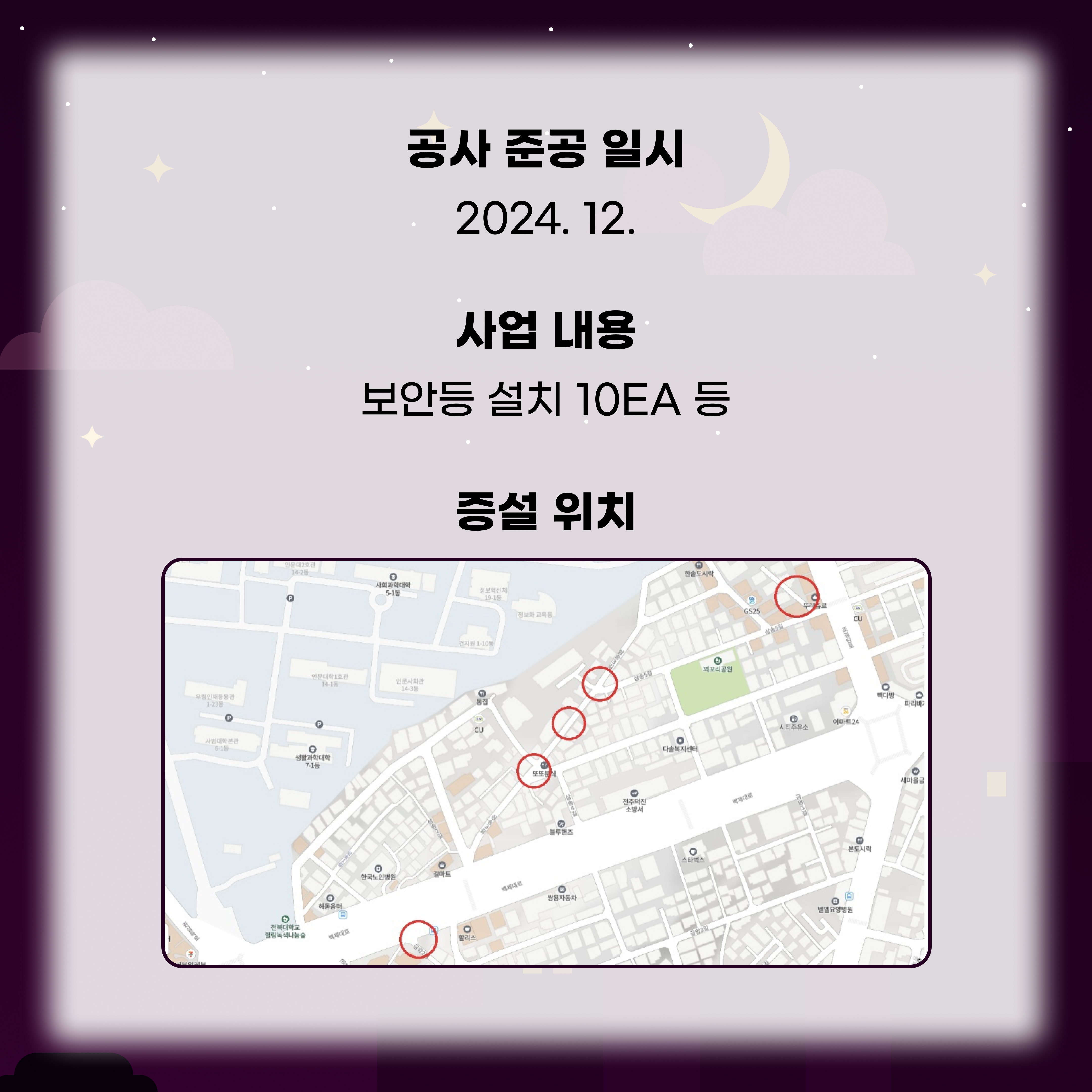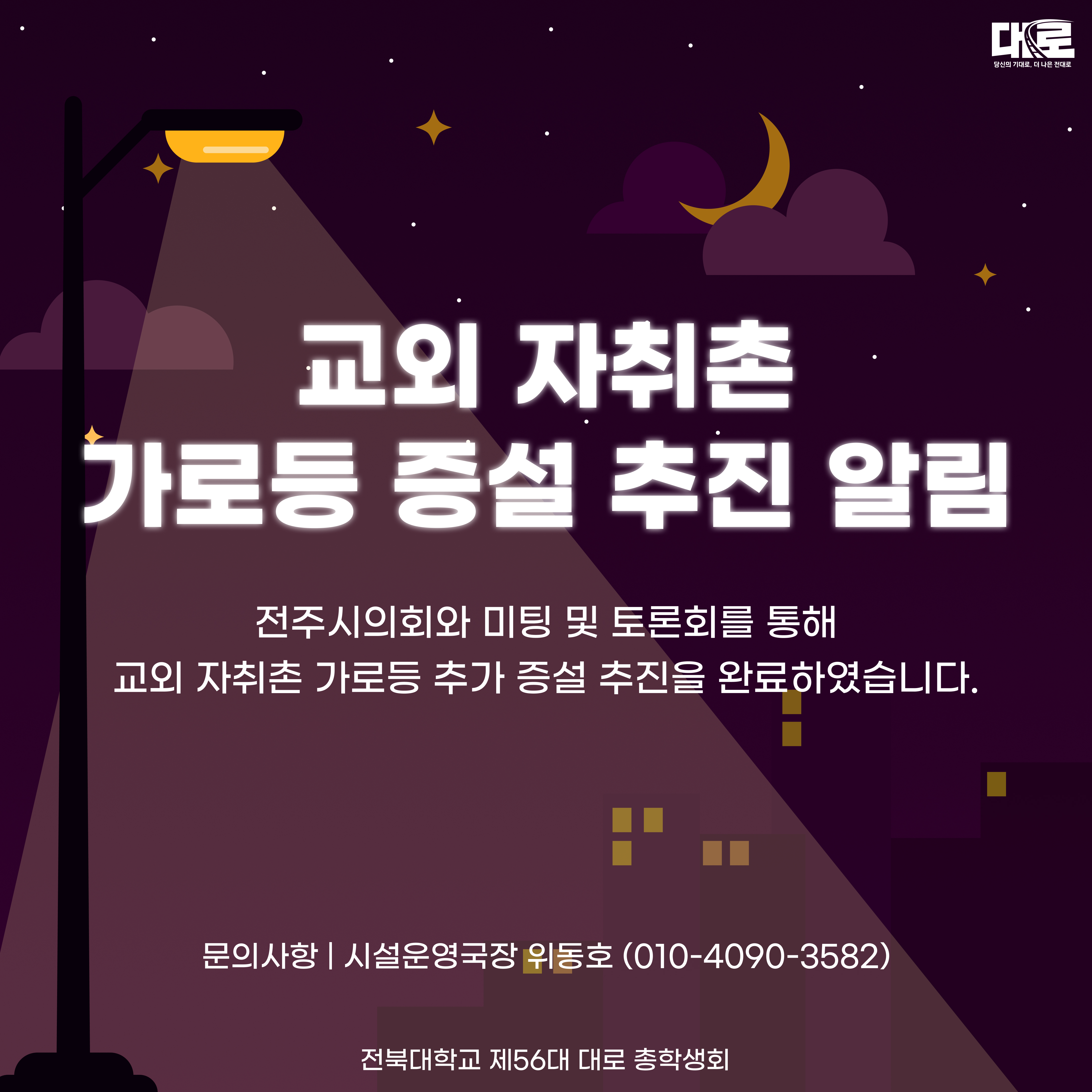 학우님들의 안전한 귀가를 위하여 교외 자취촌 가로등 증설 추진을 완료하였음을 알립니다.