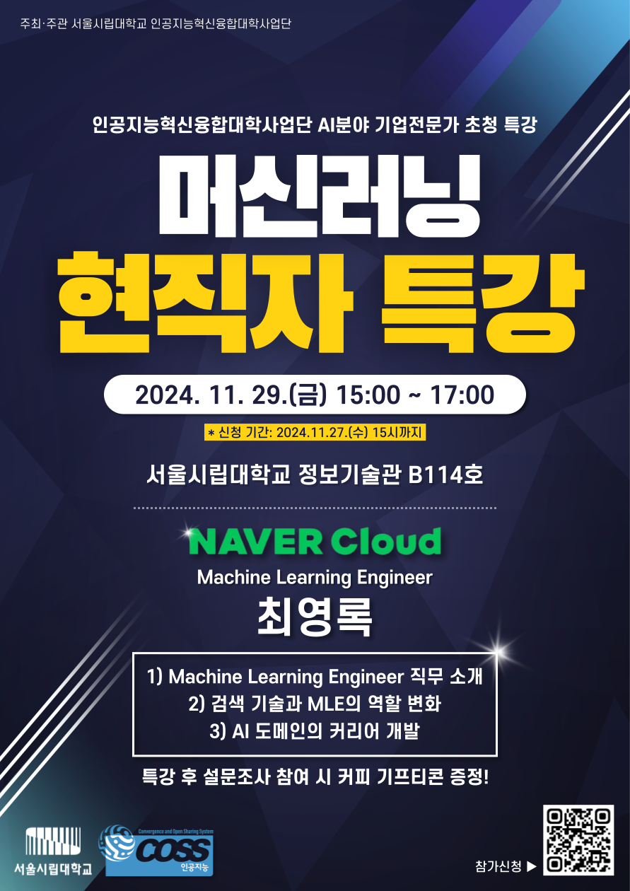 서울시립대학교 인공지능혁신융합대학사업단에서 AI분야 기업전문가 초청 특강을 진행합니다.