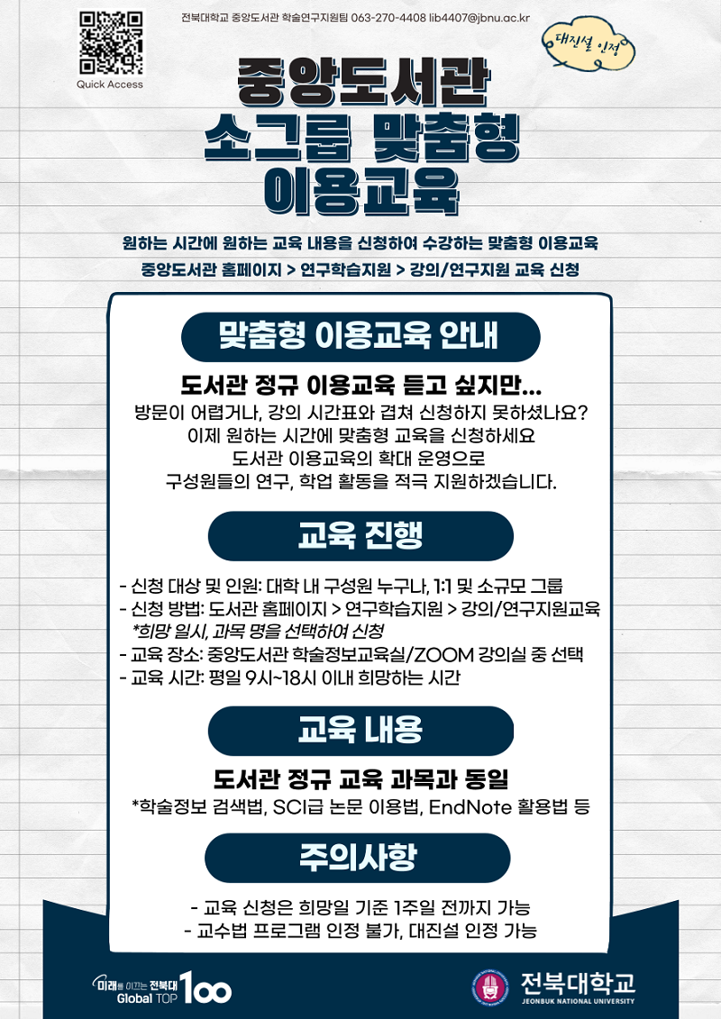 4. 교육문의: 중앙도서관 학술연구지원팀 (270-4408, lib4407@jbnu.ac.kr)