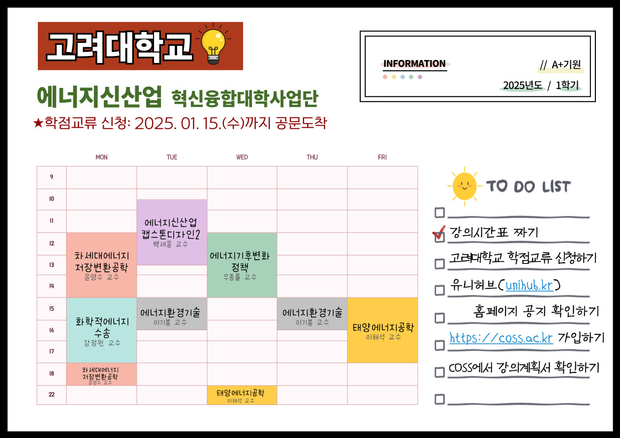 2025학년도 1학기 고려대학교 에너지신산업 혁신융합대학 학점교류를 안내하오니, 희망하는 학생은 기한내에 신청하여 주시기 바랍니다.