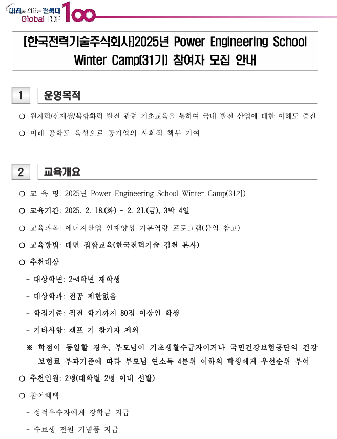 [한국전력기술주식회사]2025년 Power Engineering School Winter Camp(31기) 참여자 모집 안내