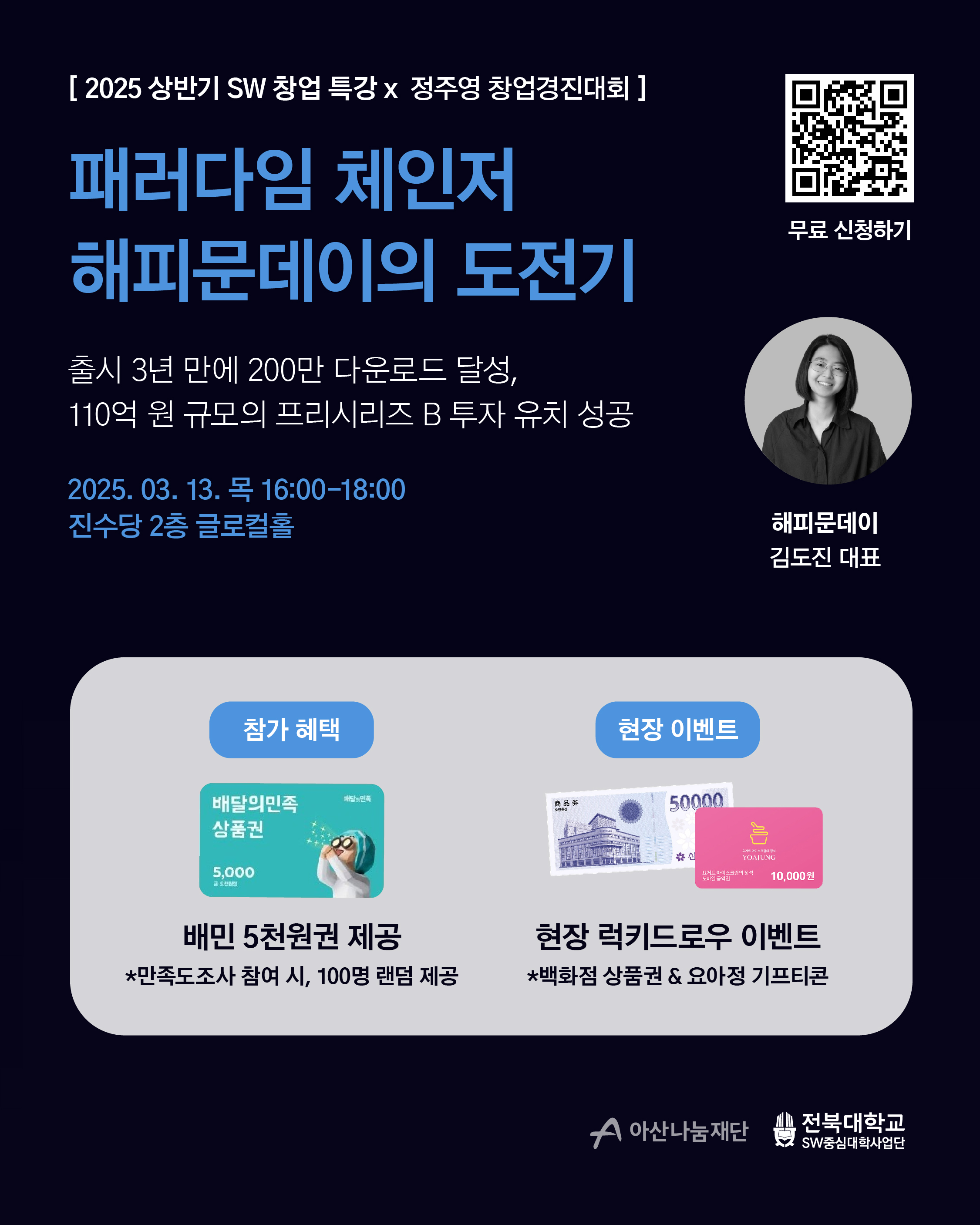 전북대학교 SW중심대학사업단에서는 아산나눔재단과 협업하여 정주영창업경진대회 설명 및 SW 창업 특강을 안내하오니 본교 재학생 및 도내 창업에 관심있는 모든 분들의 참여 신청 바랍니다.