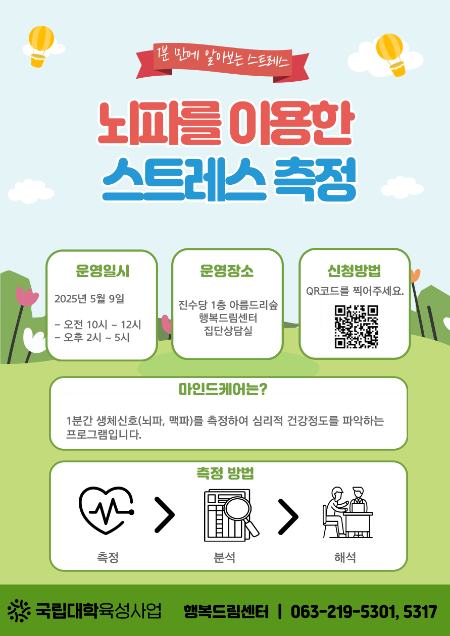 뇌파측정기계를 통해 1분동안 생체 신호(맥박, 뇌파)를 측정하여 스트레스 지수, 두뇌 컨디션 등 심리적 건강정도를 파악하는 프로그램입니다.