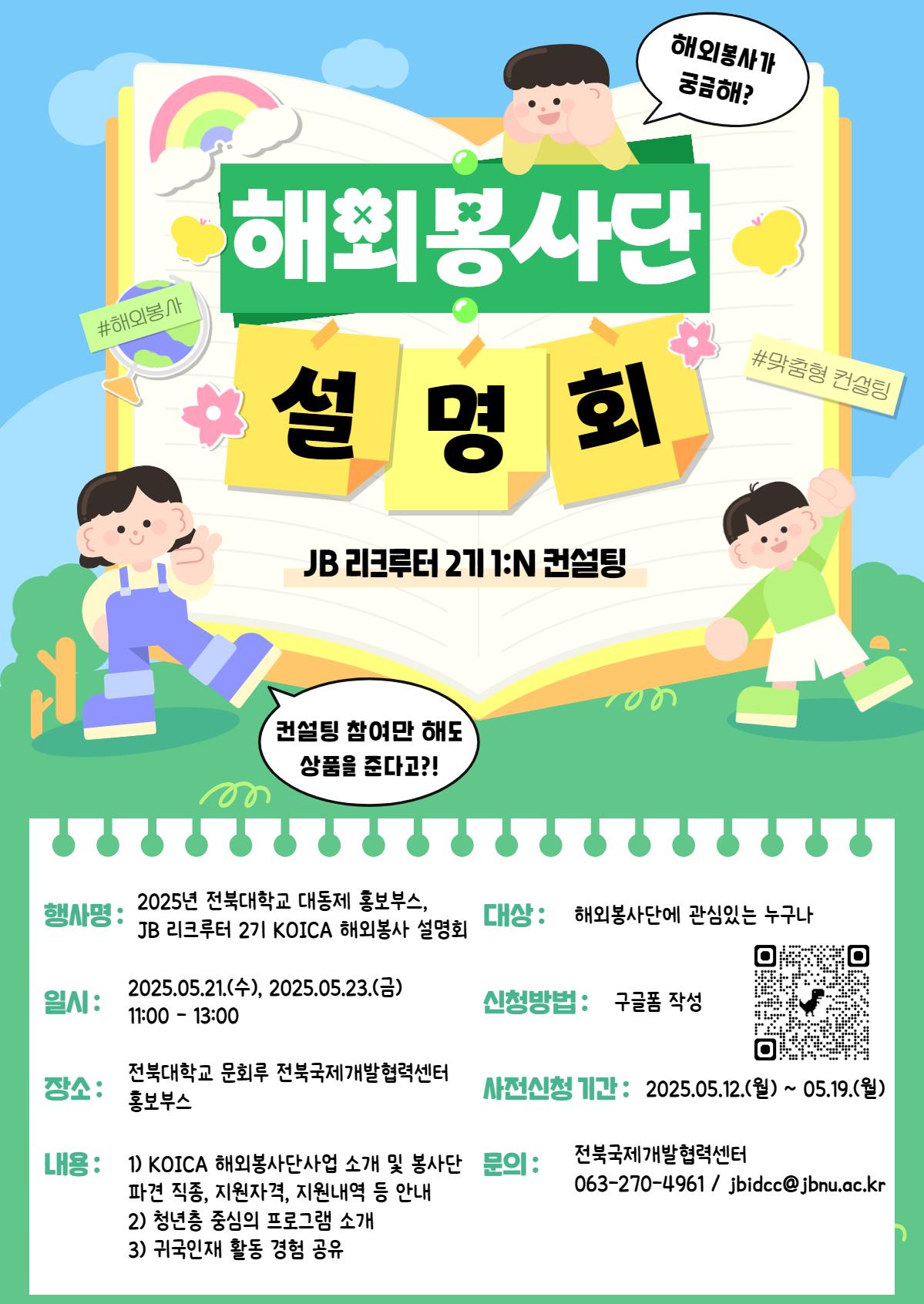 2025년 전북대학교 대동제 홍보부스에서 JB 리크루터 2기와 함께하는 KOICA 해외봉사단 설명회를 진행합니다. 해외봉사에 관심있는 전북지역 인재 및 일반인을 대상으로 개인 경력&역량에 따른 맞춤형 컨설팅을 제공하고 있습니다. 컨설팅 참여자분들께는 전북국제개발협력센터 기념품을 제공하오니, 많은 참여 바랍니다 :D