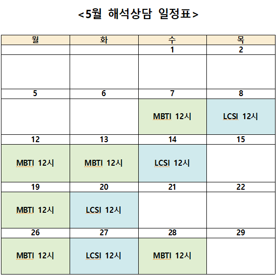 ○ 5월 심리검사 신청 일정은 5월 넷째주 월요일(5/19) 오후에 확인할 수 있습니다.