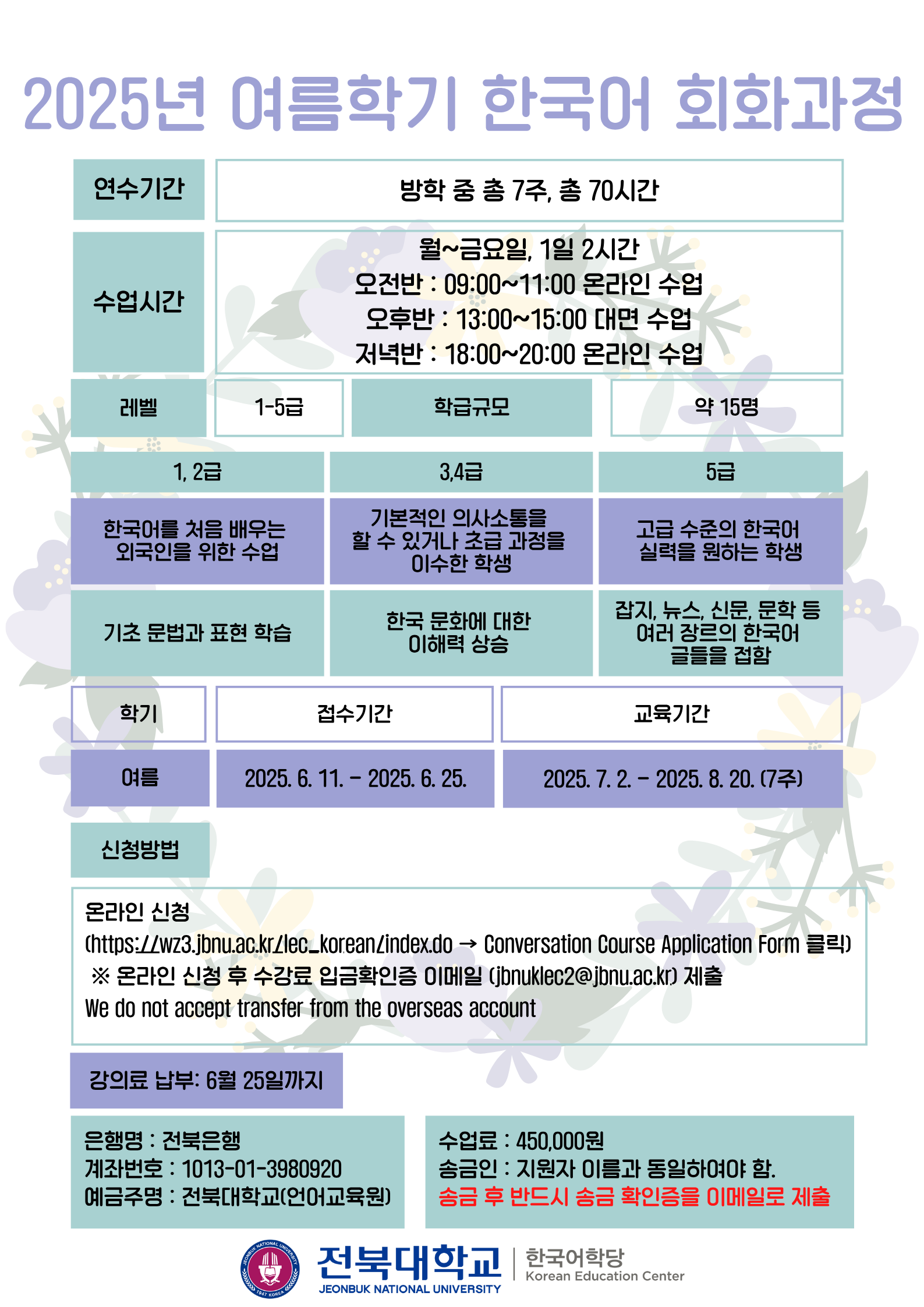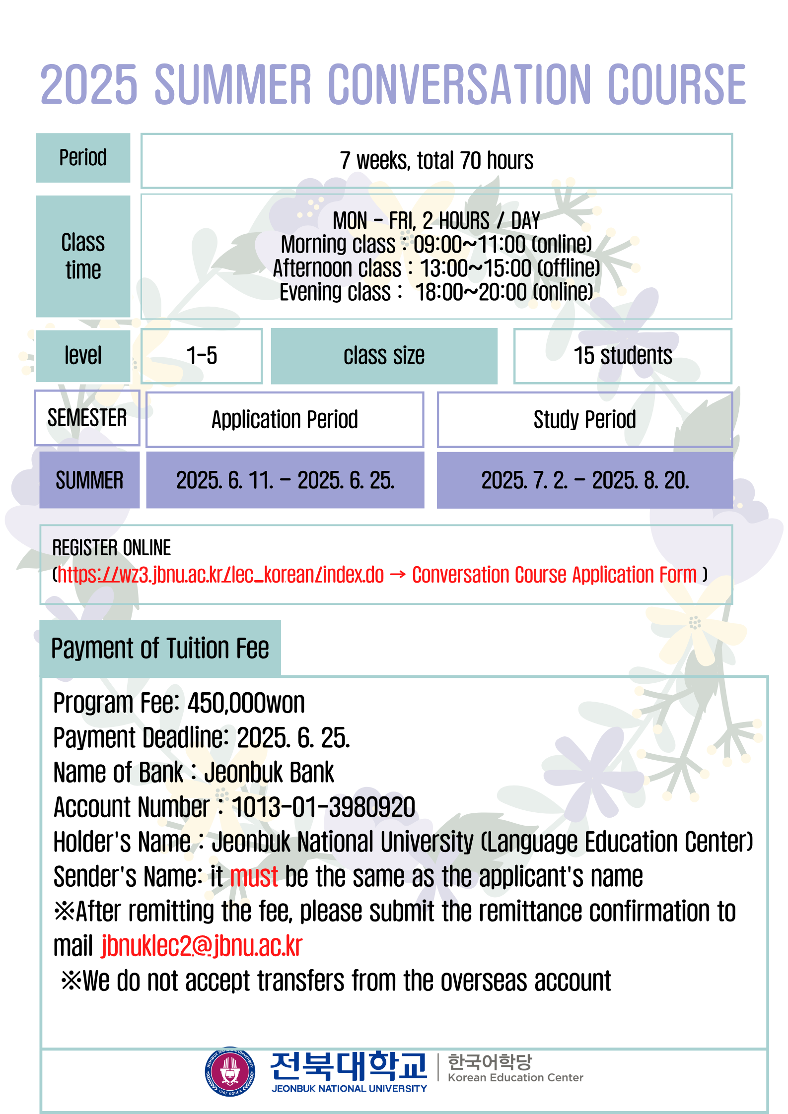 ※ After completing the payment, please send the receipt to our email: jbnuklec2@jbnu.ac.kr