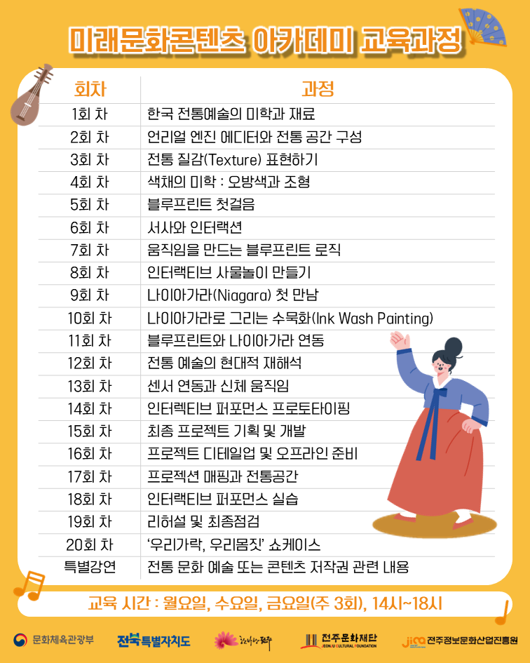 - 전통문화와 신기술 융합 콘텐츠 기획자 및 창작자 양성 후 산업 경쟁력 강화와 직접 기획 가능한 인재 발굴·육성