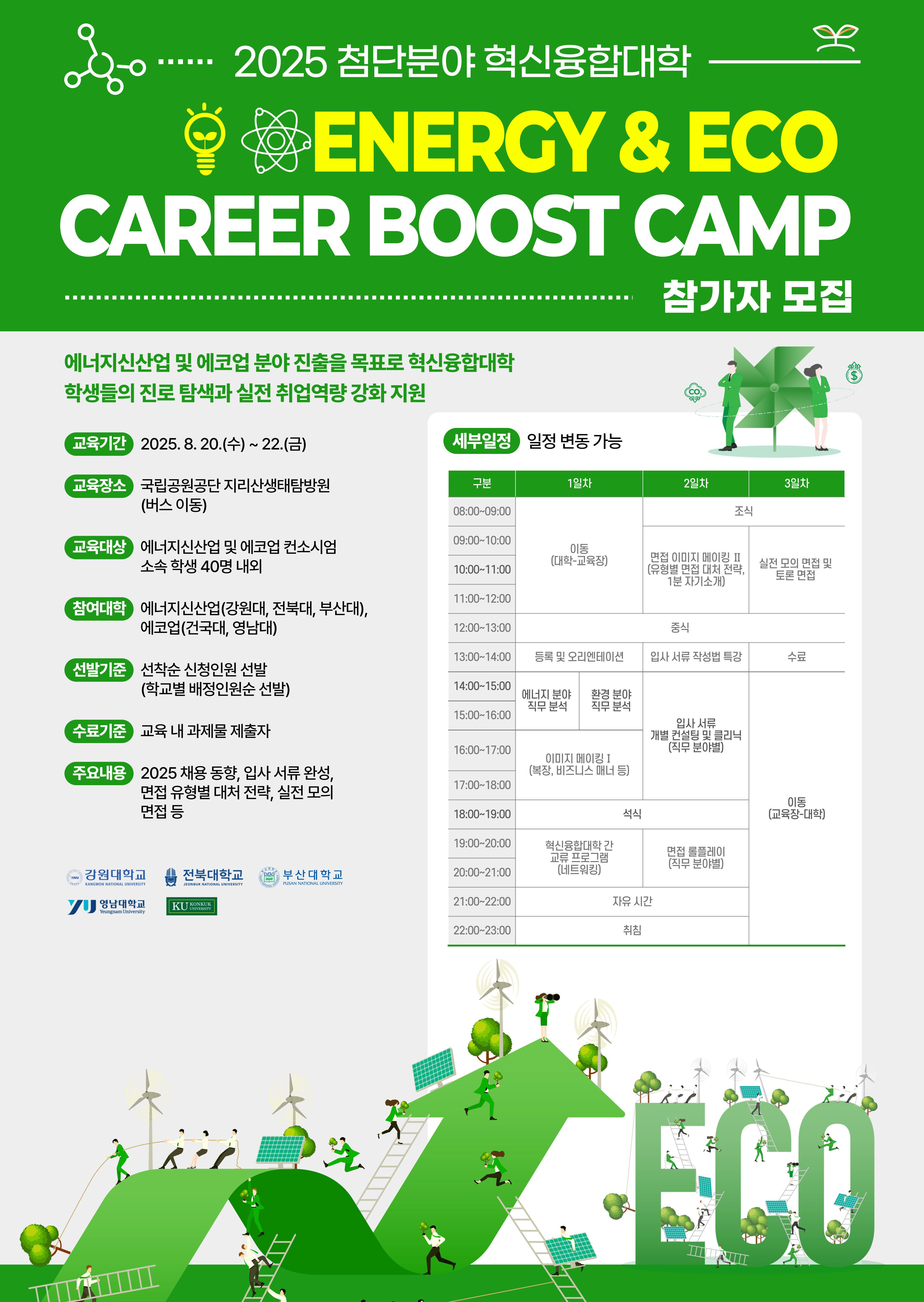 2025 첨단분야 혁신융합대학 Energy & ECO Career Boost Camp가 참여자를 모집중에 있습니다.