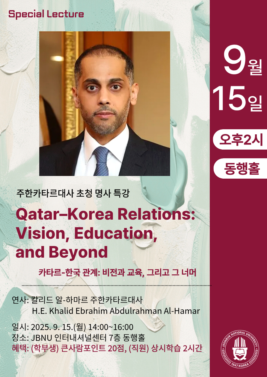 국제협력과에서 주최하는 주한카타르대사 초청 명사 특강을 안내하오니 많은 관심 바랍니다.