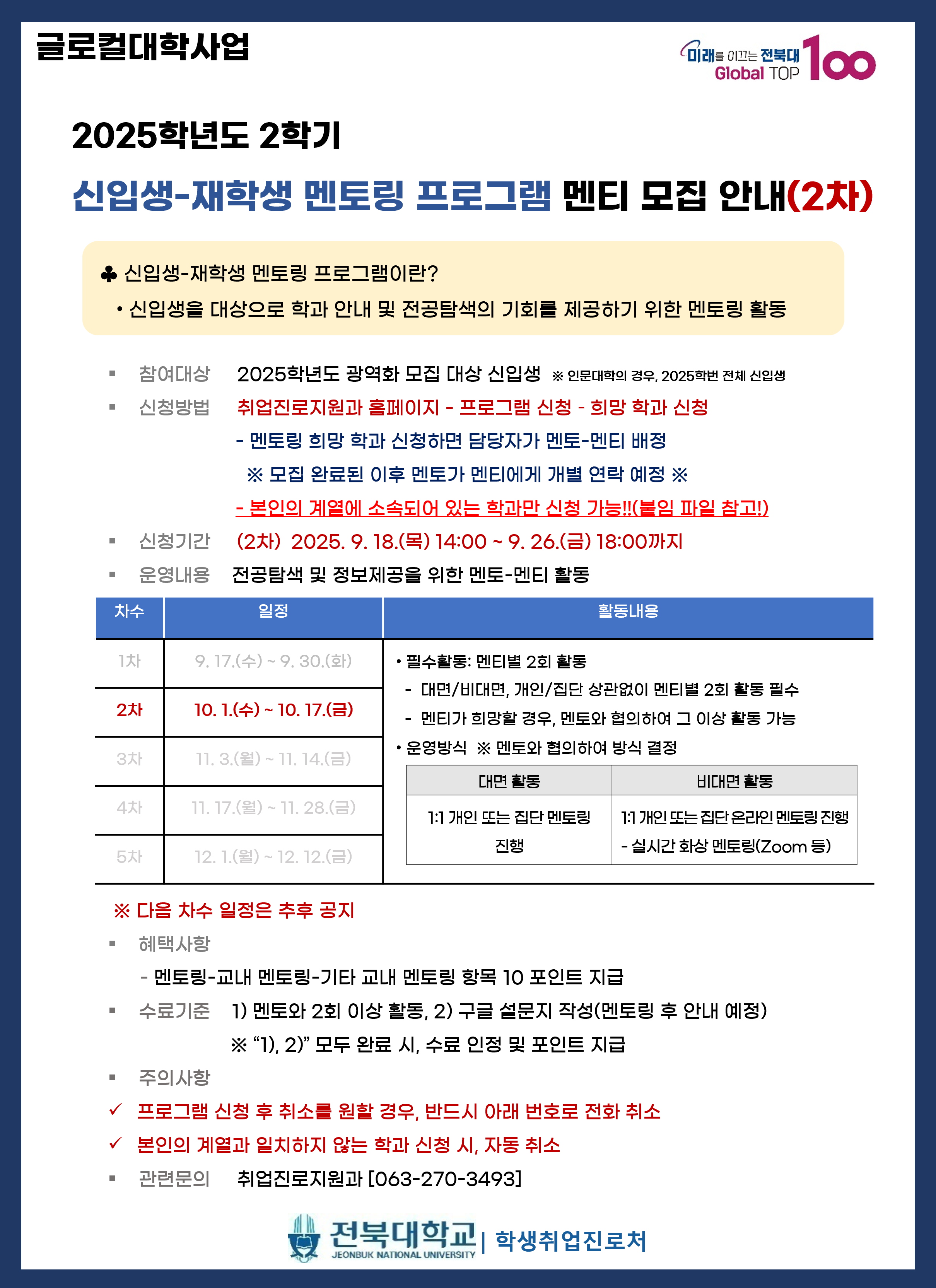 [취업진로지원과] 2025년도 2학기 신입생-재학생 멘토링 프로그램 멘티 모집(2차)
