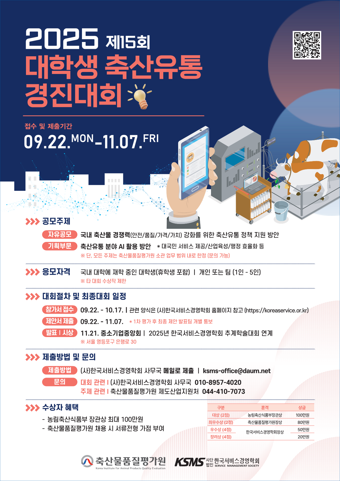 축산물품질평가원에서 2025년 제15회 대학생 축산유통 경진대회를 개최합니다. 관심있는 학생들은 많은 참여 바랍니다.
