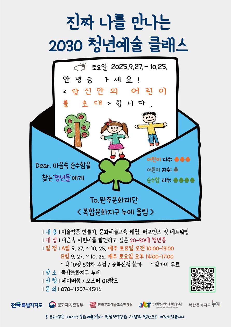 완주문화재단에서 2025 문화예술교육사 현장역량강화사업 프로그램을 운영합니다. 관심있는 학생들은 많은 참여 바랍니다.