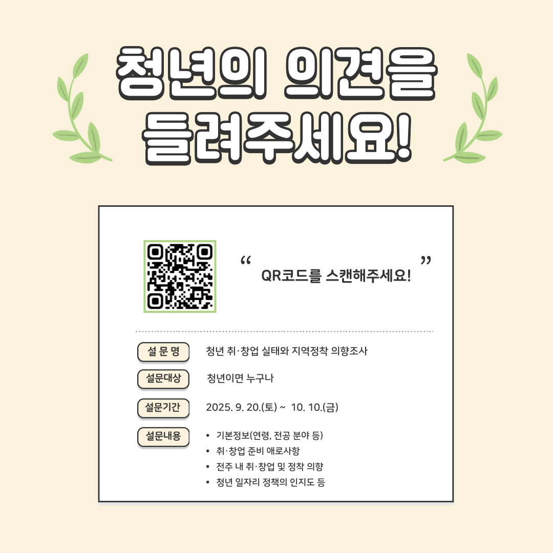 전주시에서 청년 취창업 실태와 지역정착 의향에 관한 설문조사를 실시합니다. 향후 청년 사업에 반영될 수 있도록 많은 관심 바랍니다.