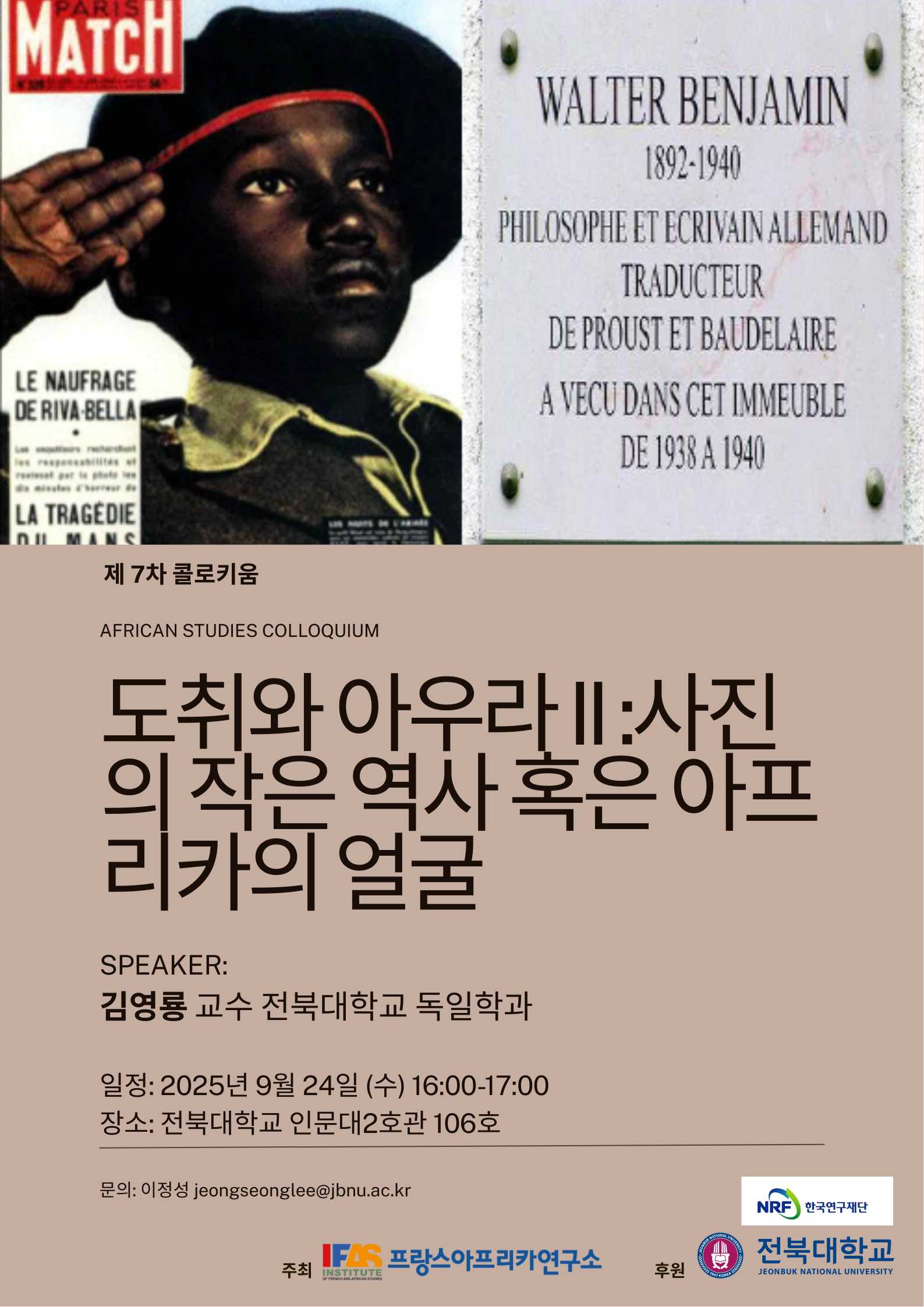 프랑스·아프리카연구소(IFAS)에서는 2025년 9월 24일 수요일 16:00-18:00에 '도취와 아우라 Ⅱ:사진의 작은 역사 혹은 아프리카의 얼굴' 라는 주제로 인문대 2호관 106호에서 콜로키움을 개최하고자 합니다.