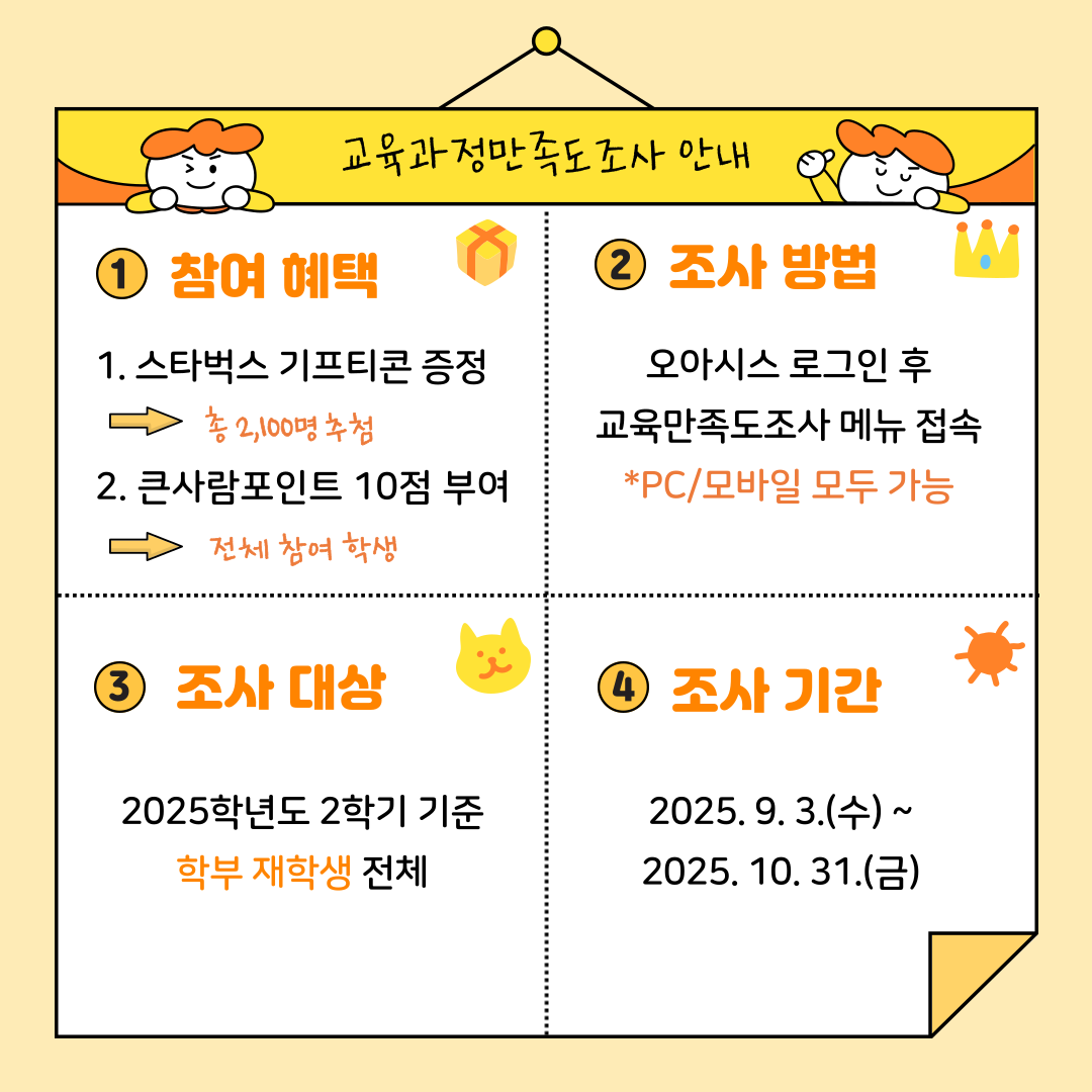 우리 대학 교육과정과 교육지원 시스템에 대한 여러분의 소중한 의견을 듣기 위해 <2025학년도 교육과정 만족도 조사>를 실시합니다.