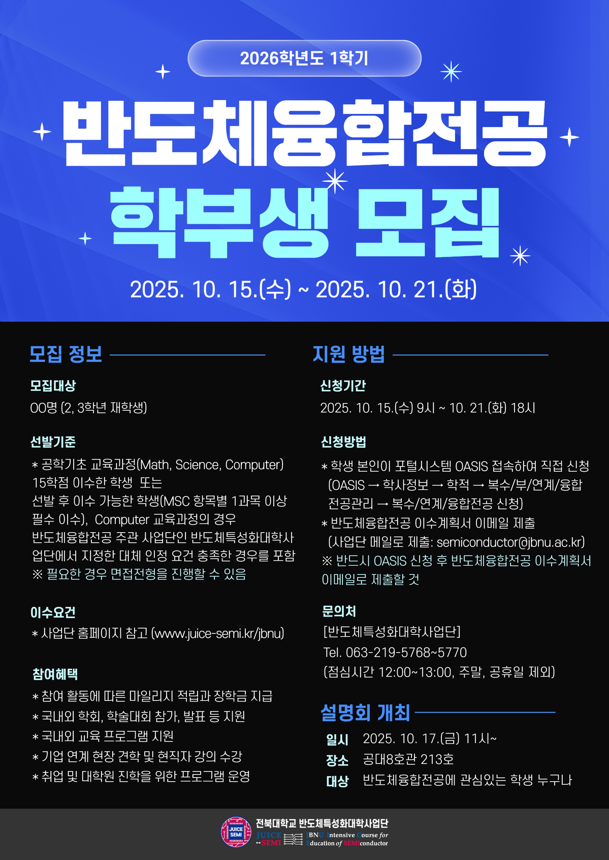 반도체특성화대학사업단에서 2026년도 1학기 반도체융합전공 학부생을 모집하오니 많은 관심 바랍니다.