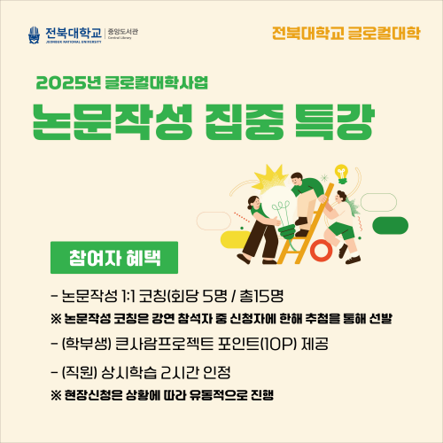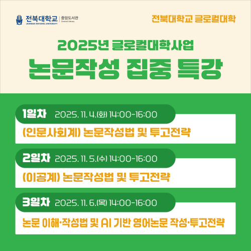 글로컬대학사업의 일환으로 전북대학교 중앙도서관이 준비한 이번 특강은 인문사회계부터 이공계, 그리고 영어논문까지—