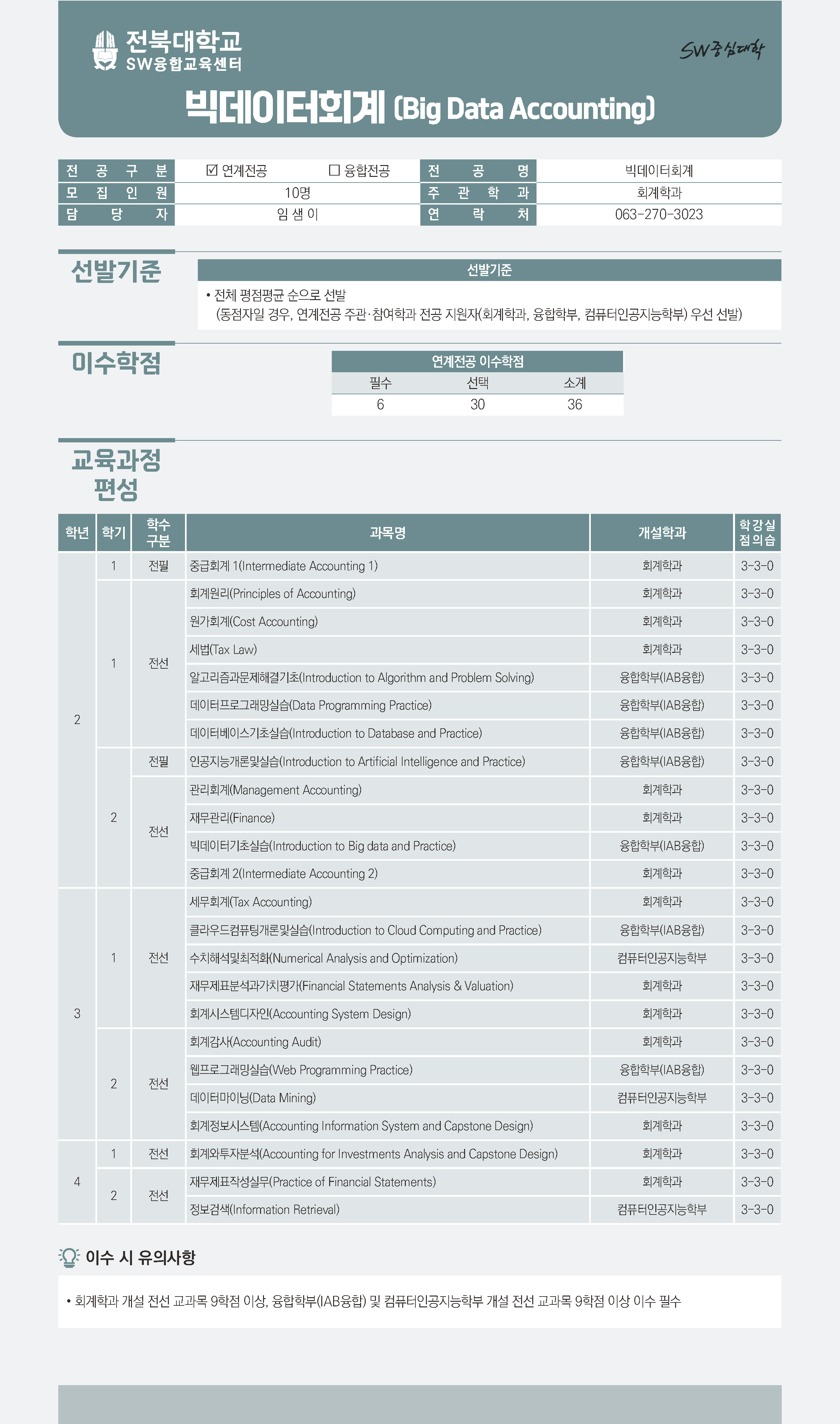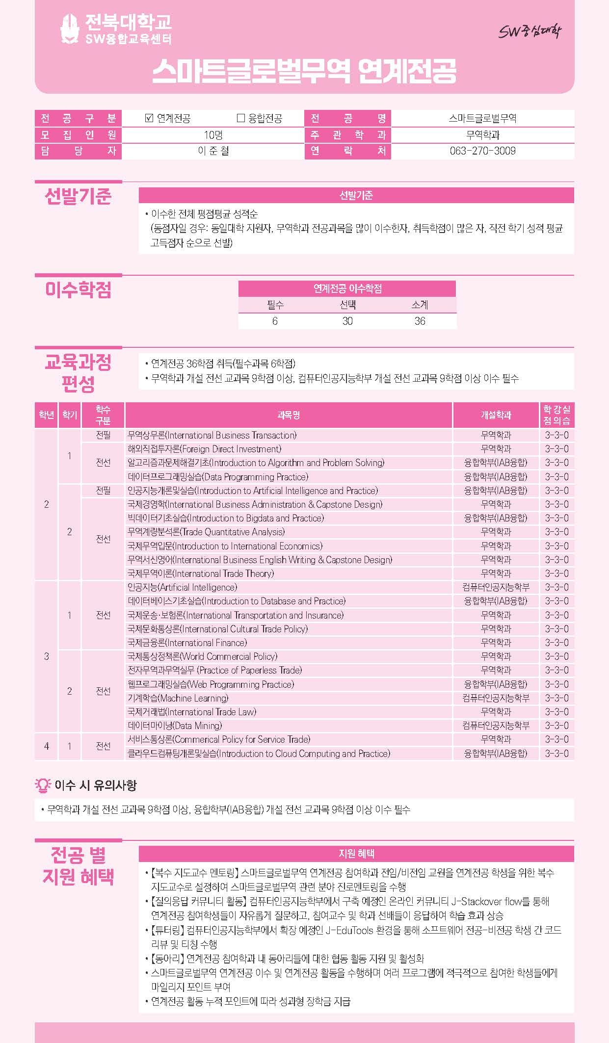 - SW연계전공: 스마트융합미디어학, 과학융합빅데이터, 공간정보AI, 메디컬AI, 스마트글로벌무역, 빅데이터AI, AI반도체, 빅데이터회계