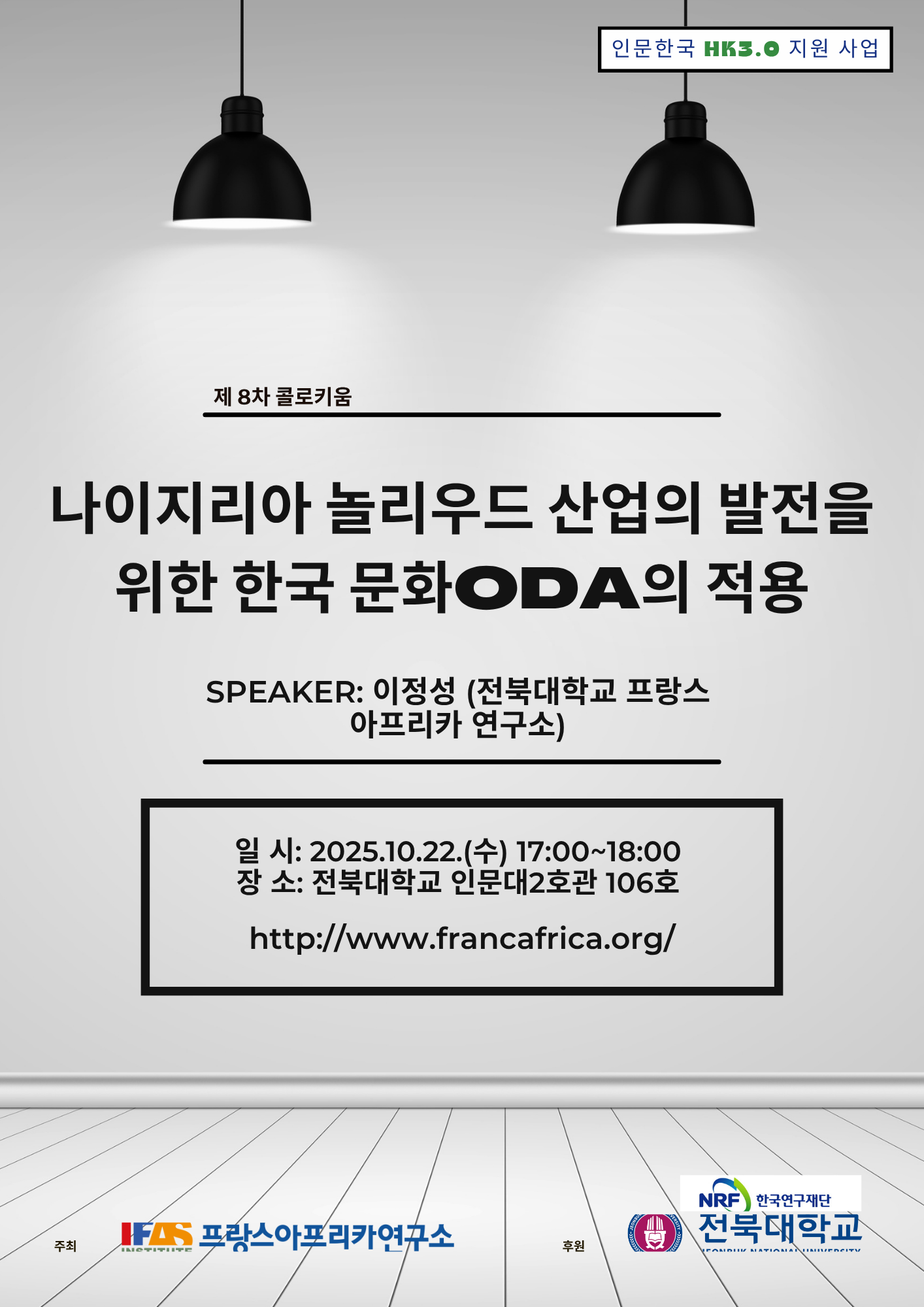 프랑스·아프리카연구소(IFAS)에서는 2025년 10월 22일 수요일 17:00-18:00에 '나이지리아 놀리우드 산업의 발전을 위한 한국 문화ODA의 적용' 라는 주제로 인문대 2호관 106호에서 콜로키움을 개최하고자 합니다.