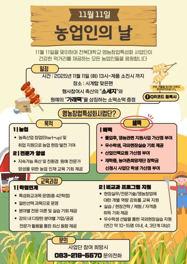 영농창업특성화 사업단에서 준비한 농업인 날 퀴즈도 맞히시고(QR로 진행) 맛있는 간식도 받아 가세요!~