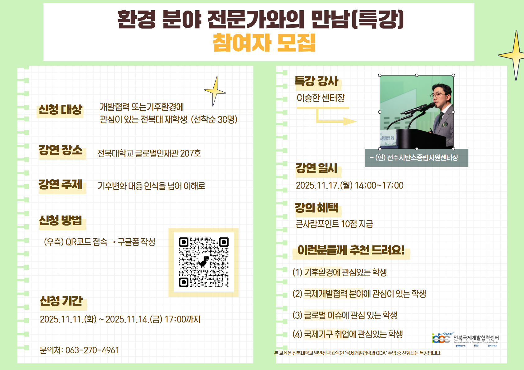 2025년 11월 17일(월) '환경 분야 전문가와의 만남(특강)' 참여자를 모집합니다.