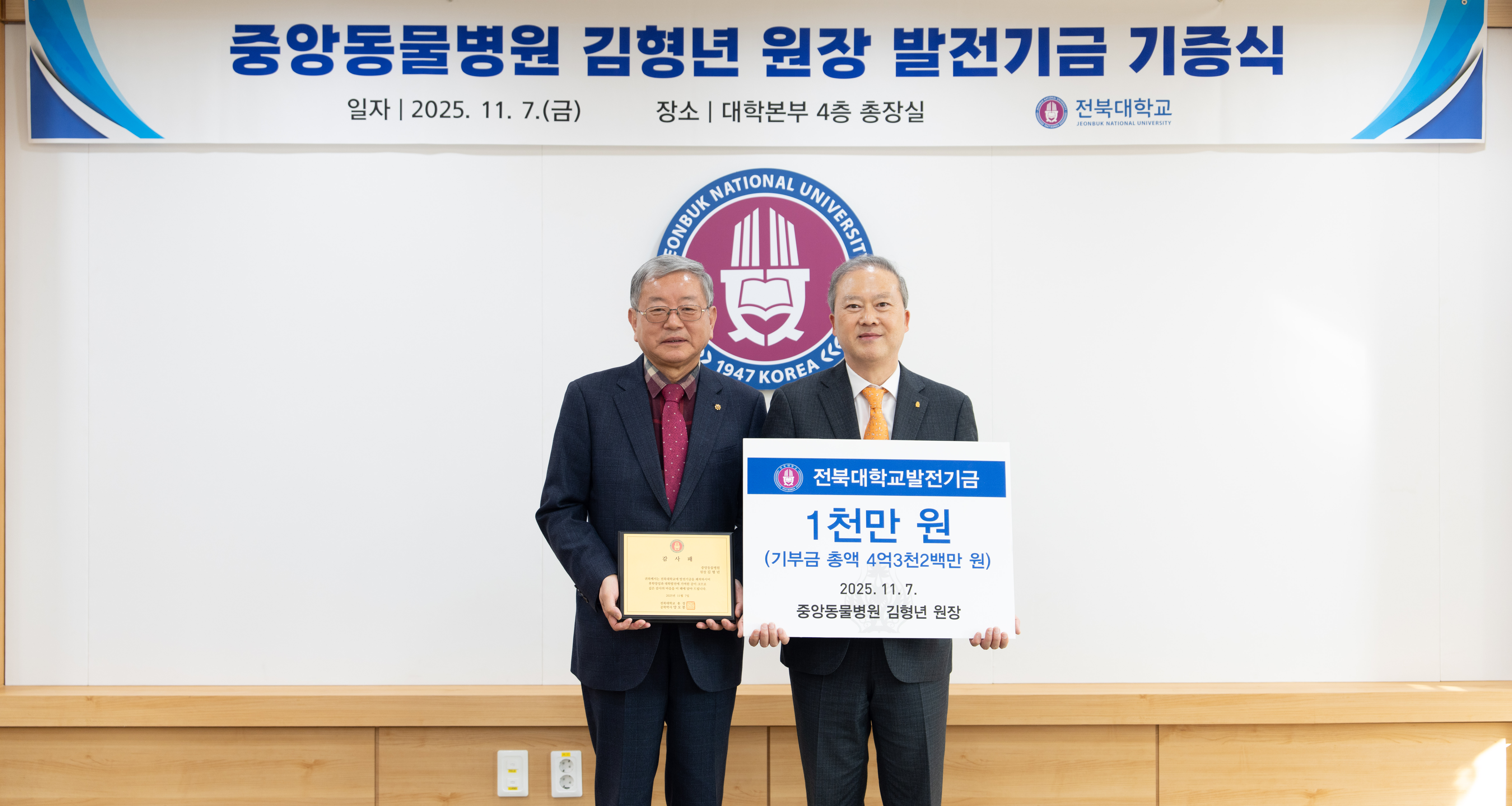 전북대학교는 11월 7일 대학본부 4층 총장실에서 양오봉 총장을 비롯한 주요 보직자들이 참석한 가운데 김형년 원장에게 감사패를 전달하고, 오랜 세월 변함없는 나눔의 뜻에 깊은 감사를 전했다.