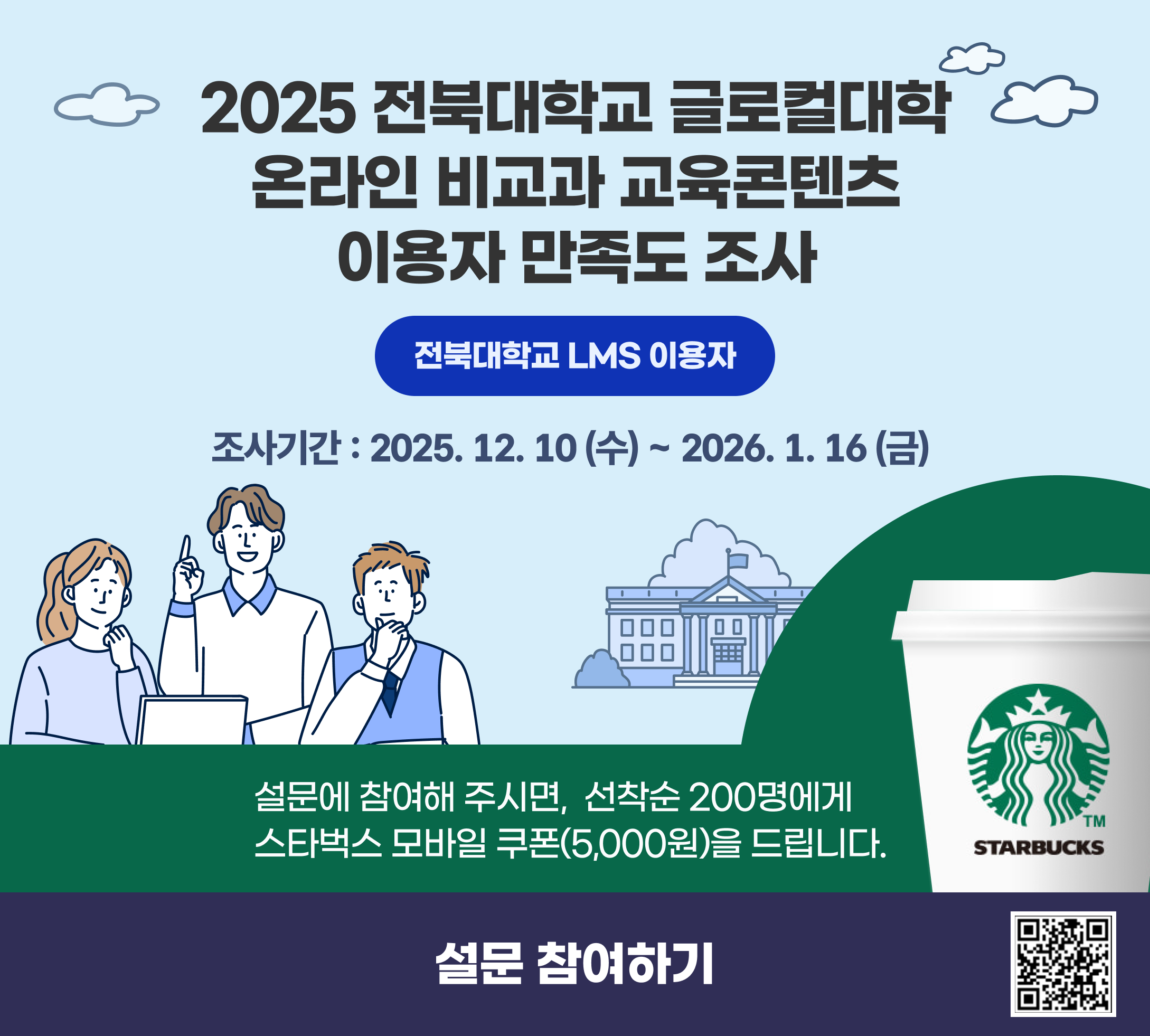 2025년 전북대학교 글로컬대학 온라인 비교과 교육콘텐츠 이용자 만족도 조사를 시행하오니 많은 참여 바랍니다.