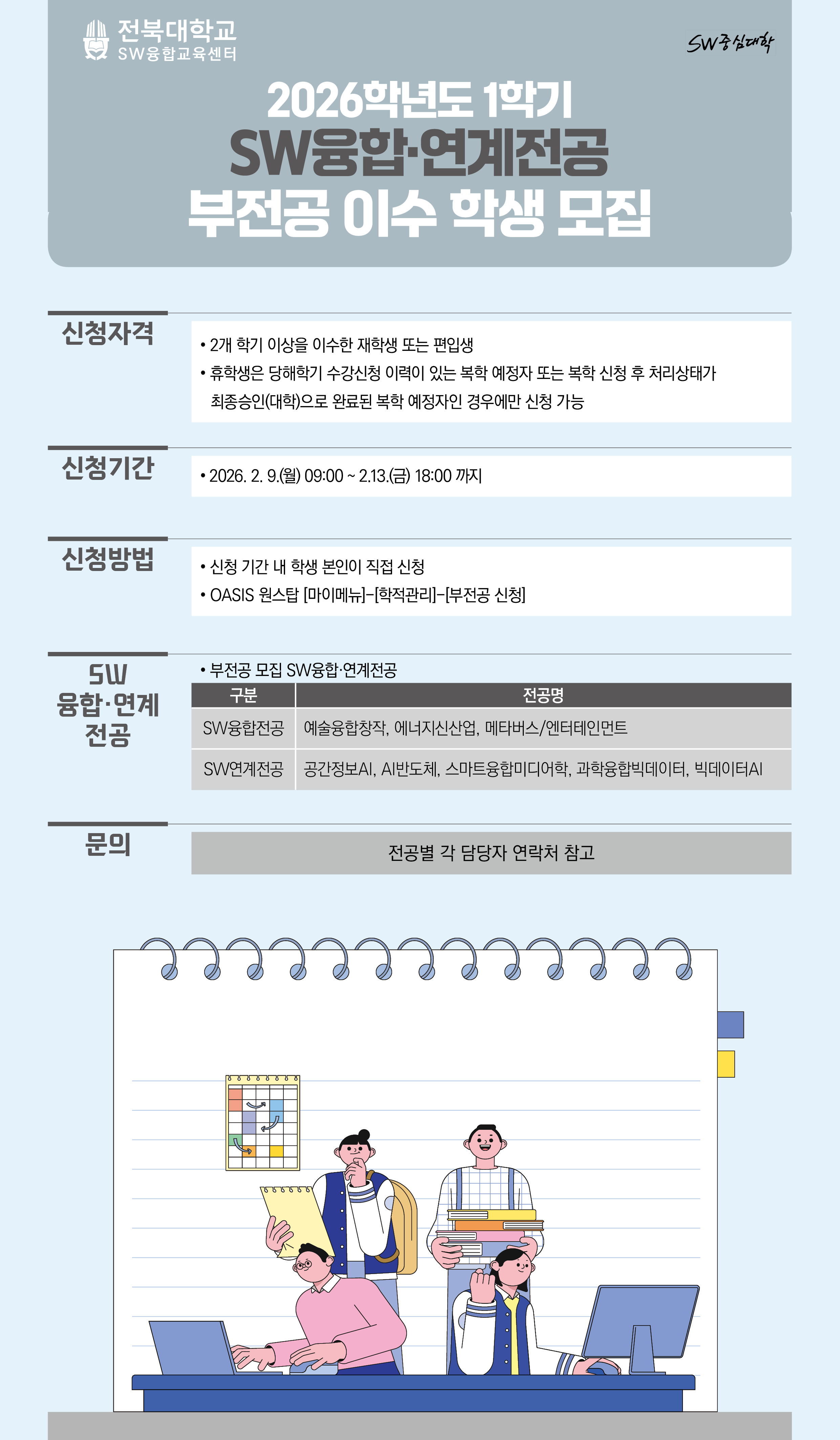 2026학년도 1학기 SW융합·연계전공 부전공 이수 학생을 모집하오니 많은 관심 부탁드립니다.