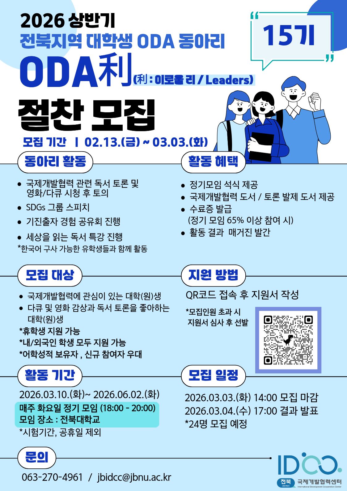 전북국제개발협력센터에서 2026 상반기 [전북지역 대학(원)생 ODA 동아리 "ODA利" 15기]를 모집합니다!