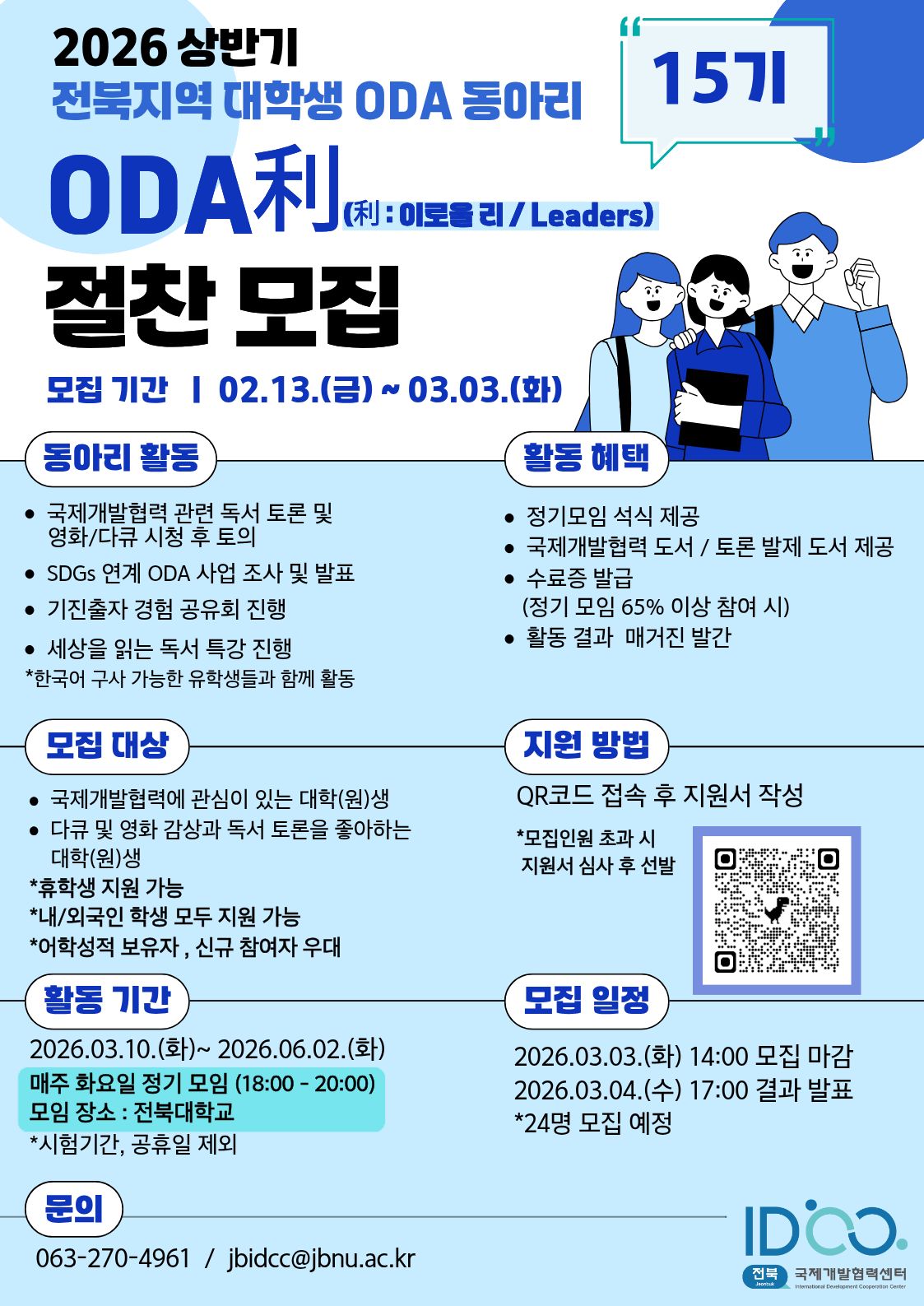 전북국제개발협력센터에서 2026 상반기 [전북지역 대학(원)생 ODA 동아리 "ODA利" 15기]를 모집합니다!