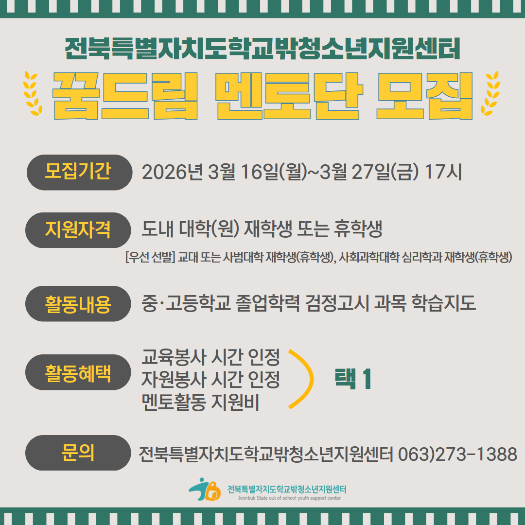 (전북특별자치도청소년상담복지센터) 2026년 전북학교밖청소년지원센터 학습지원 꿈드림 멘토단 모집 안내