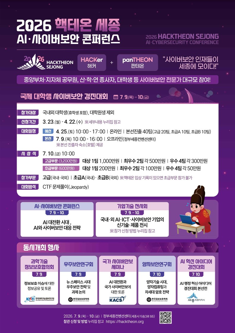세종특별자치시에서 「2026 핵테온 세종(HackTheon Sejong)」 국제 대학생 사이버보안 경진대회를 개최합니다. 관심있는 학생들의 참여 바랍니다.