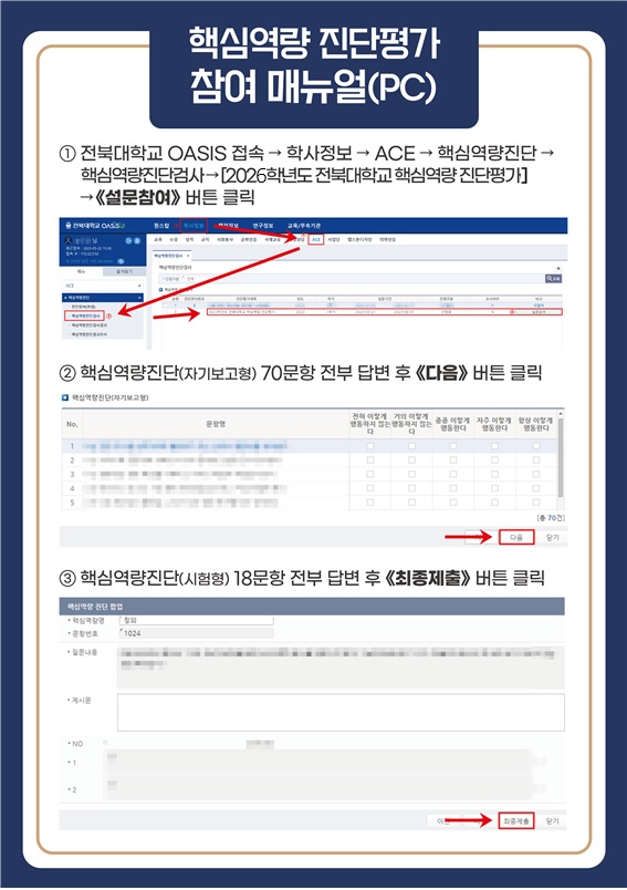 - 오아시스 접속 → 학사정보 → ACE → 핵심역량진단(검사) → 【설문참여】