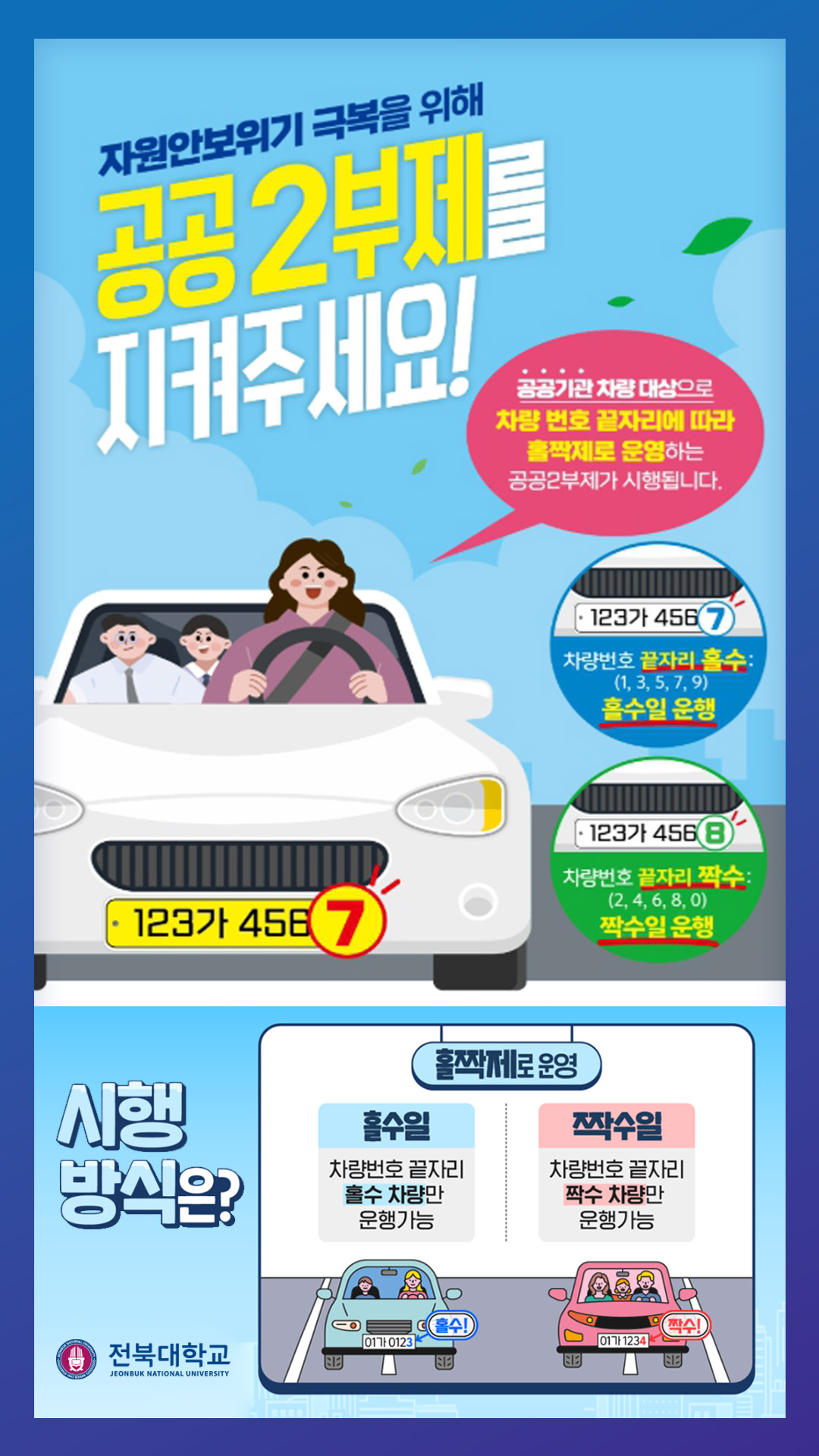자원안보위기 원유 경계 단계발령에 따라 승용차 5부제에서 승용차 2부제로 시행하오니 적극 협조하여 주시기 바랍니다.