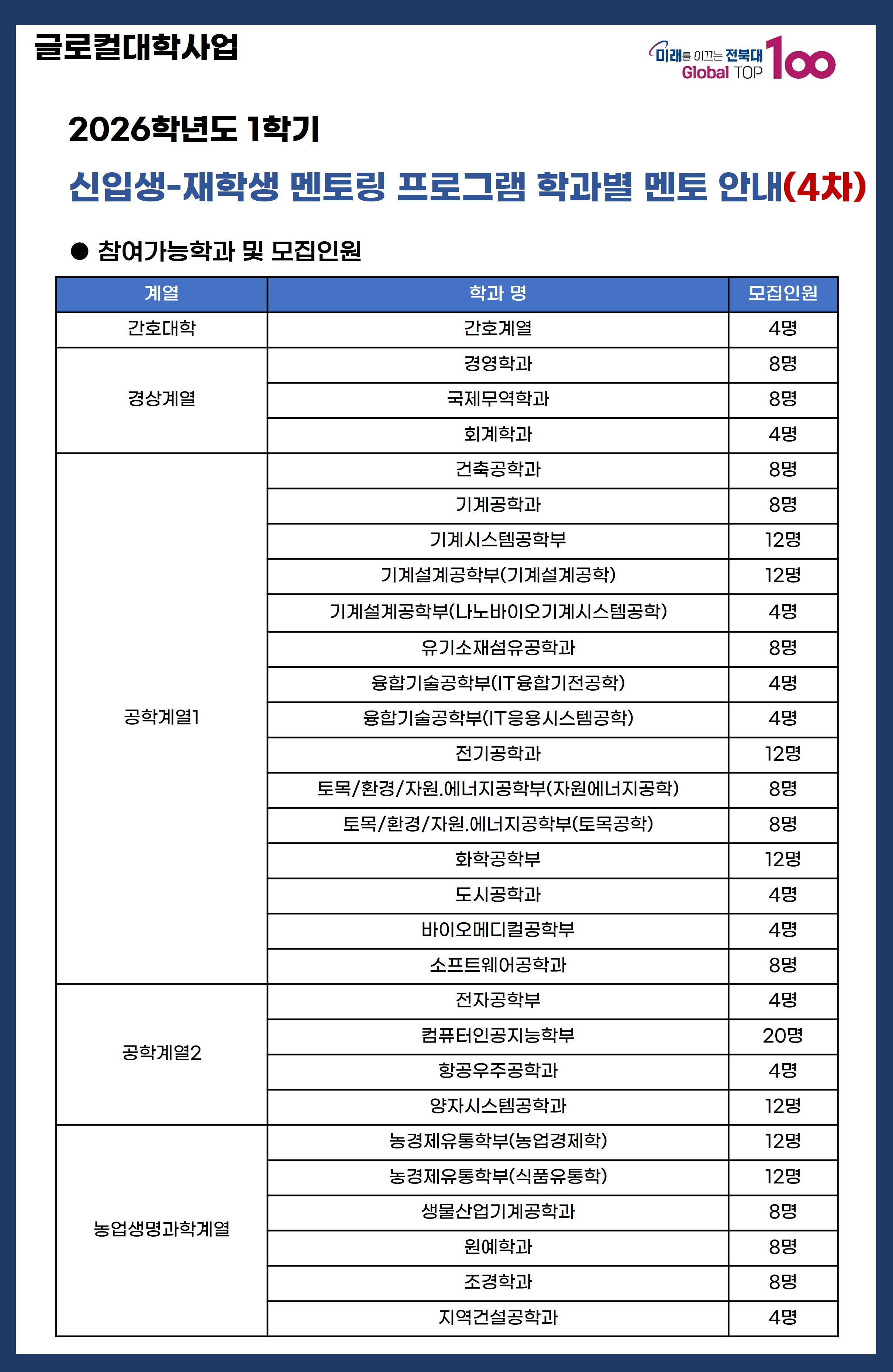 본 프로그램은 2026학년도 광역화 모집 대상 신입생에게 전공 탐색 기회를 제공하기 위해 개설된 멘토링 프로그램입니다.