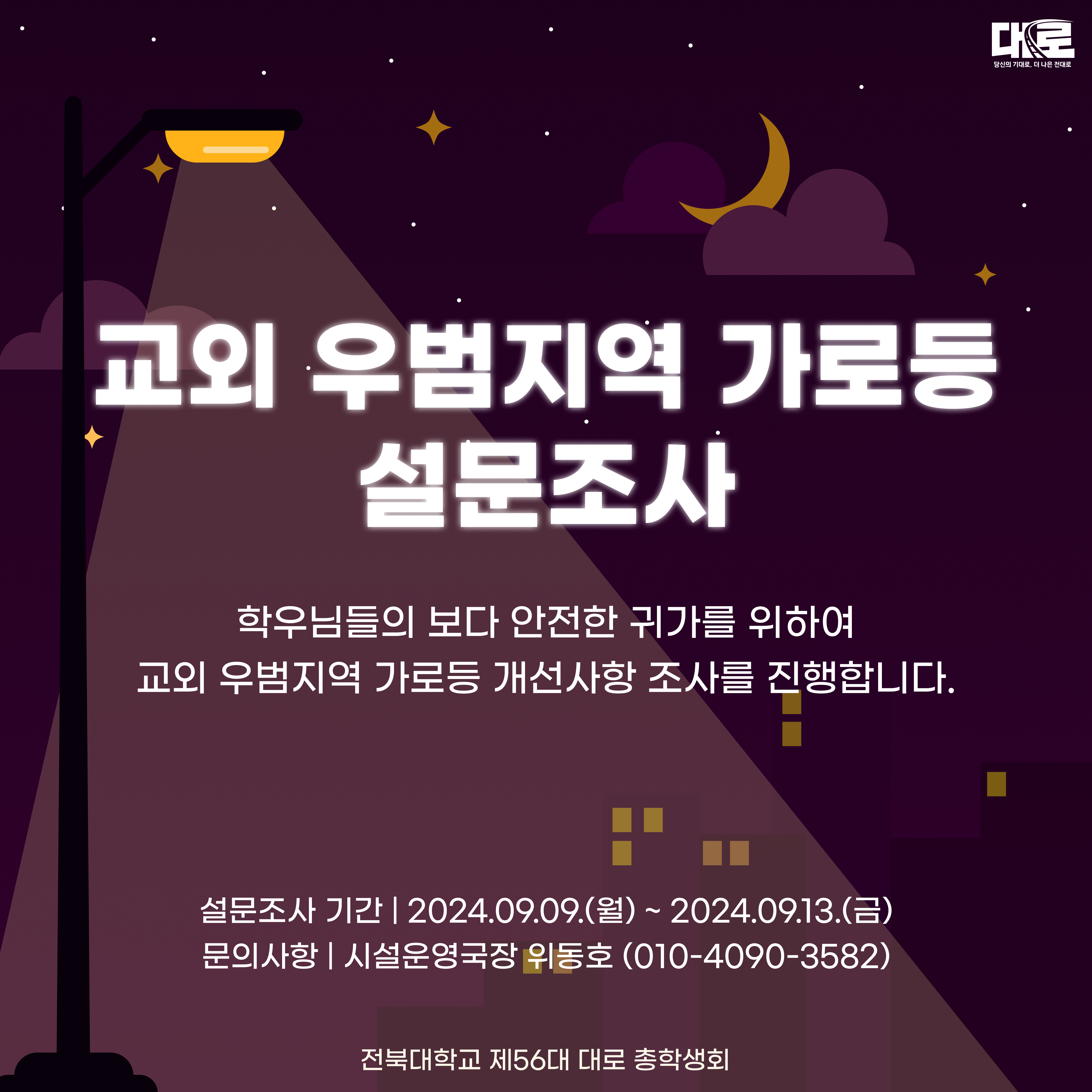 학우님들의 안전한 귀가를 위하여, 학우님들의 의견을 바탕으로 교외 우범지역 가로등 개선사항을 조사하려 합니다.