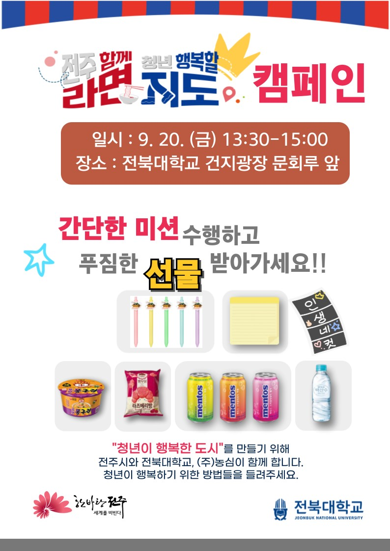 2024년 청년의 날을 맞이하여 전주시와 지역 사회복지관들이 협력해 진행하는 「전주함께라면 청년행복할지도」 캠페인을 전북대학교에서 개최합니다.