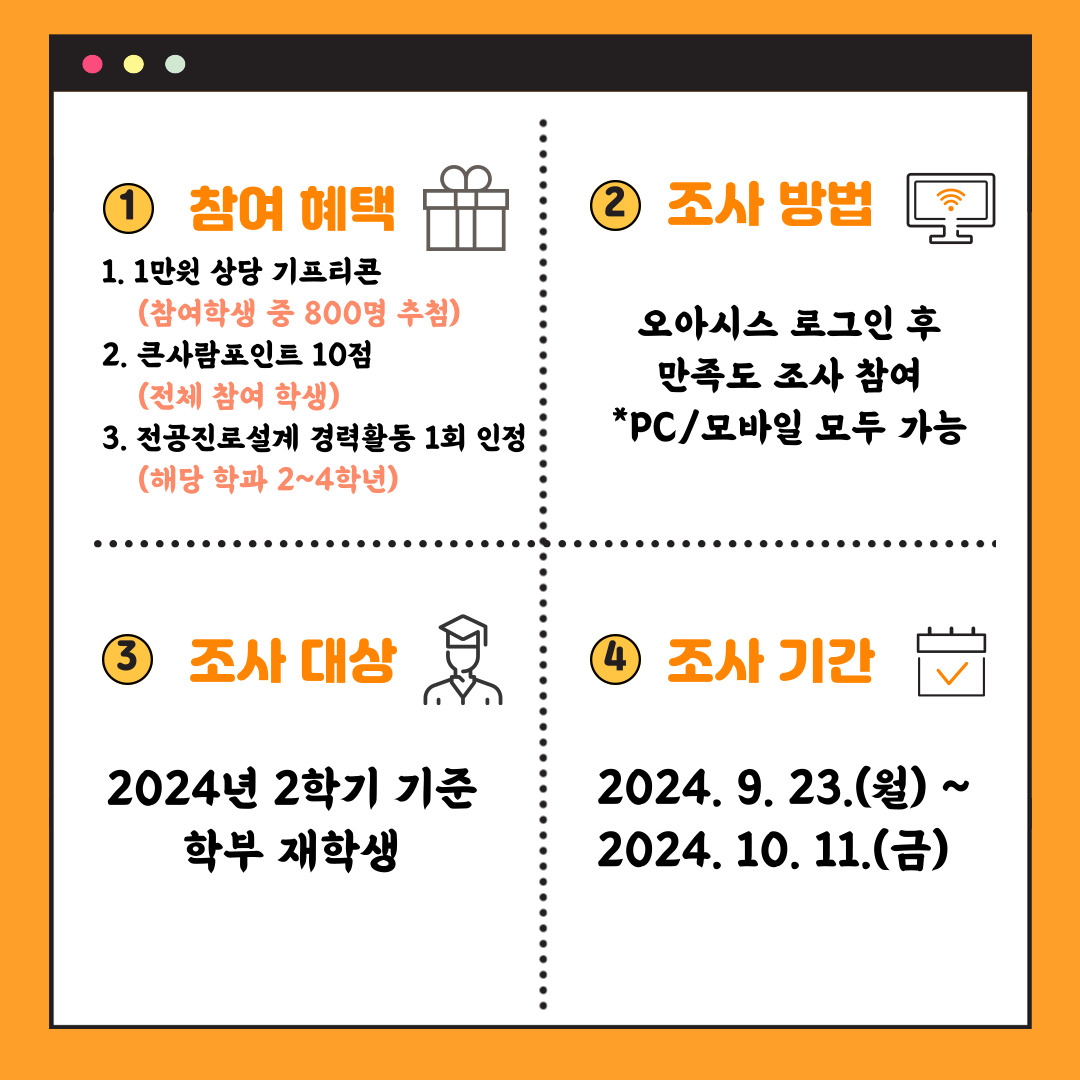 <2024 교육과정 만족도 조사>를 다음과 같이 운영하오니, 재학생들의 많은 참여 부탁드립니다.