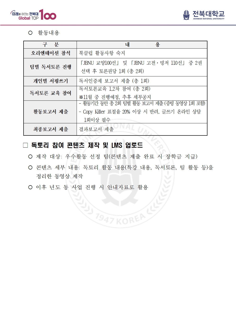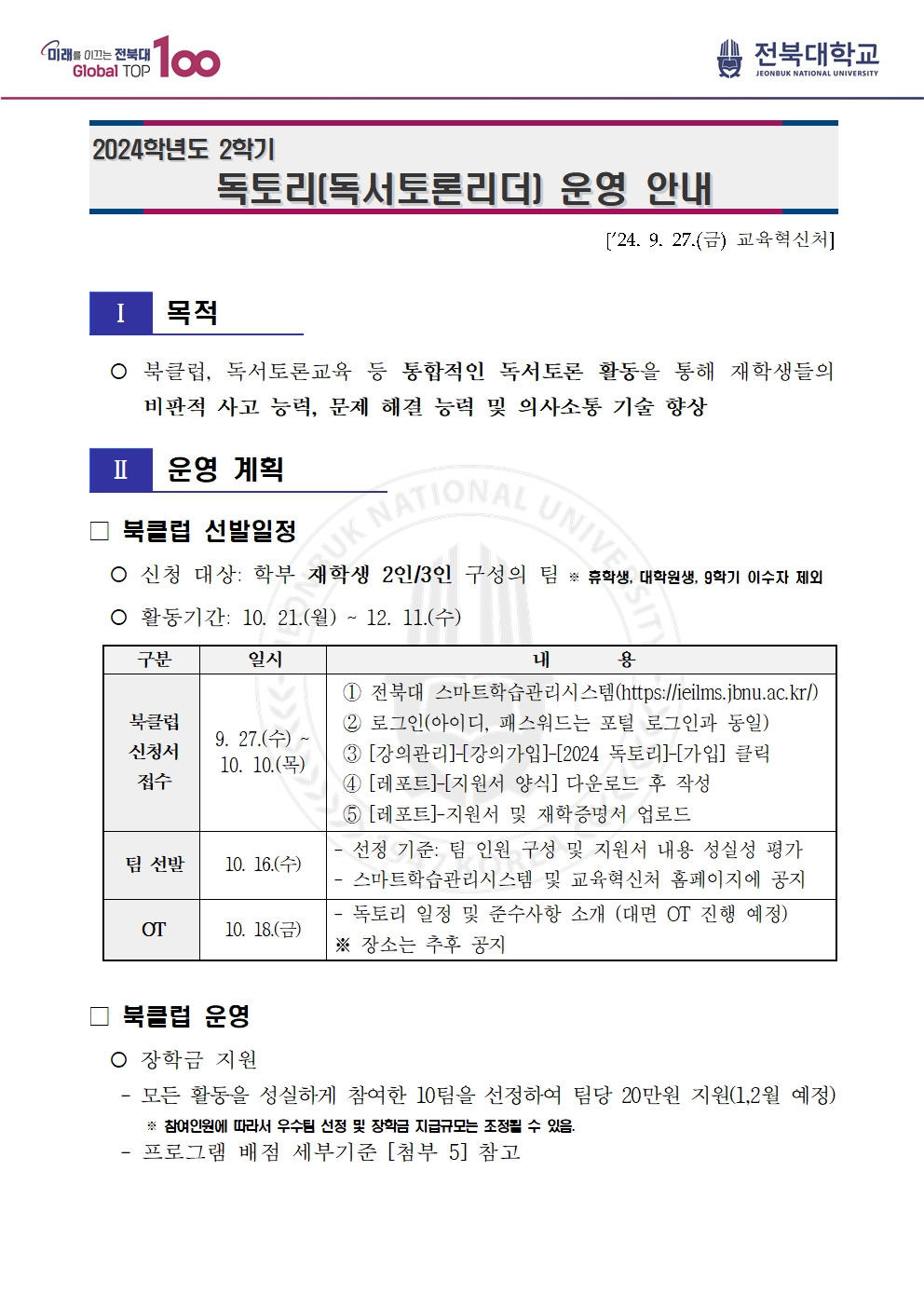 - 북클럽 신청서 접수: 10. 10.(목)