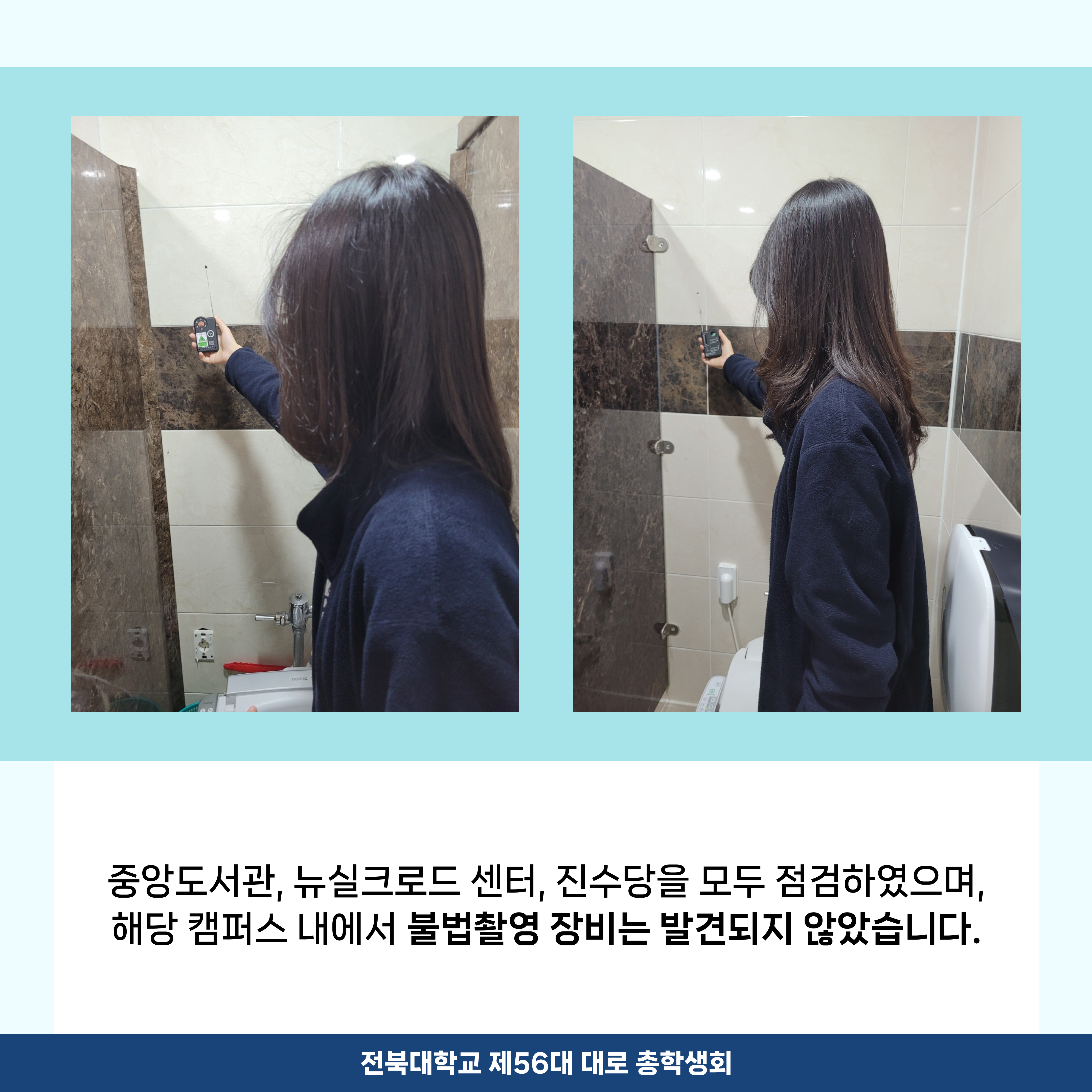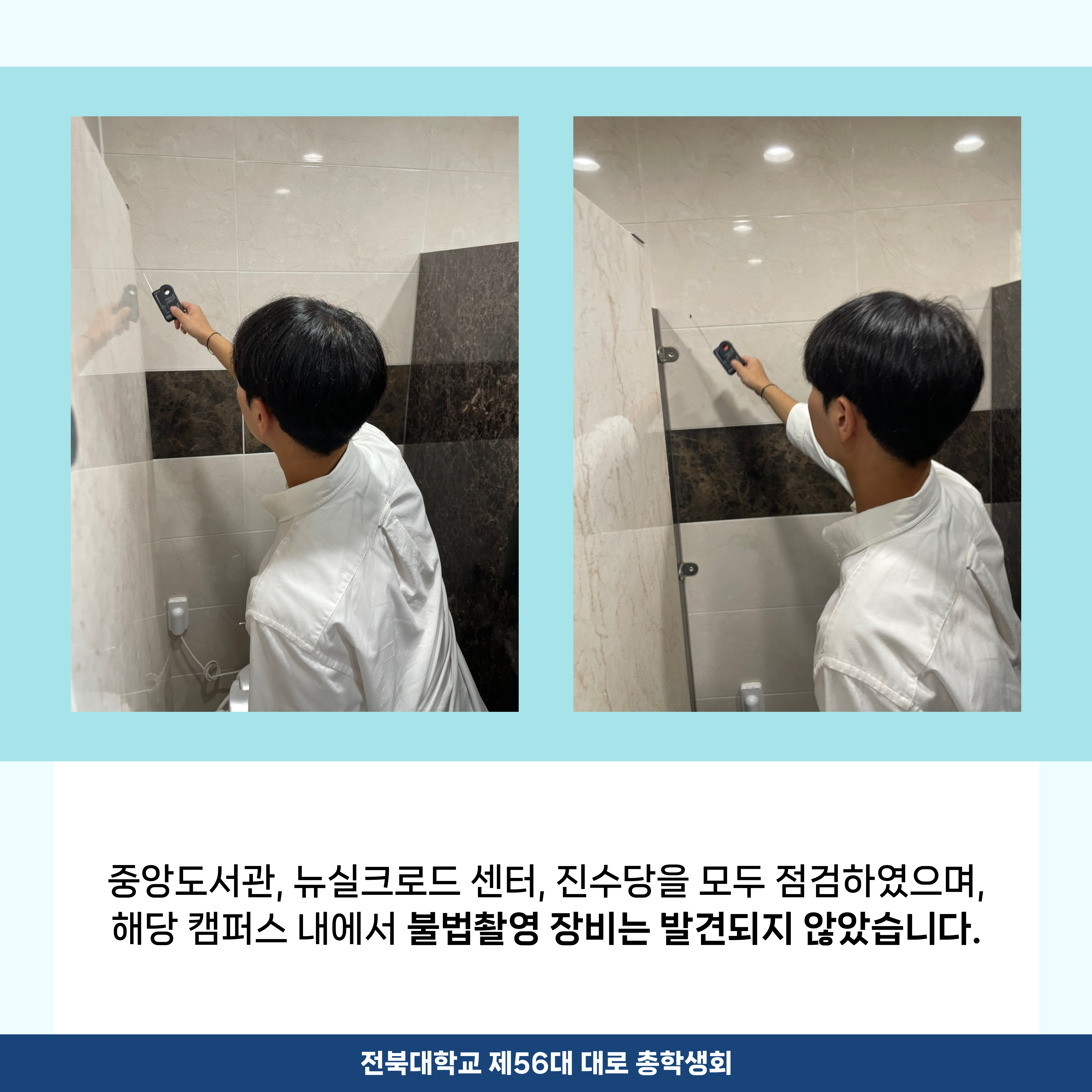 학우님들께서 안심하고 화장실을 이용하실 수 있도록, 총학생회에서 불법 촬영 장비에 대해 9월 상시 점검 완료를 알립니다.