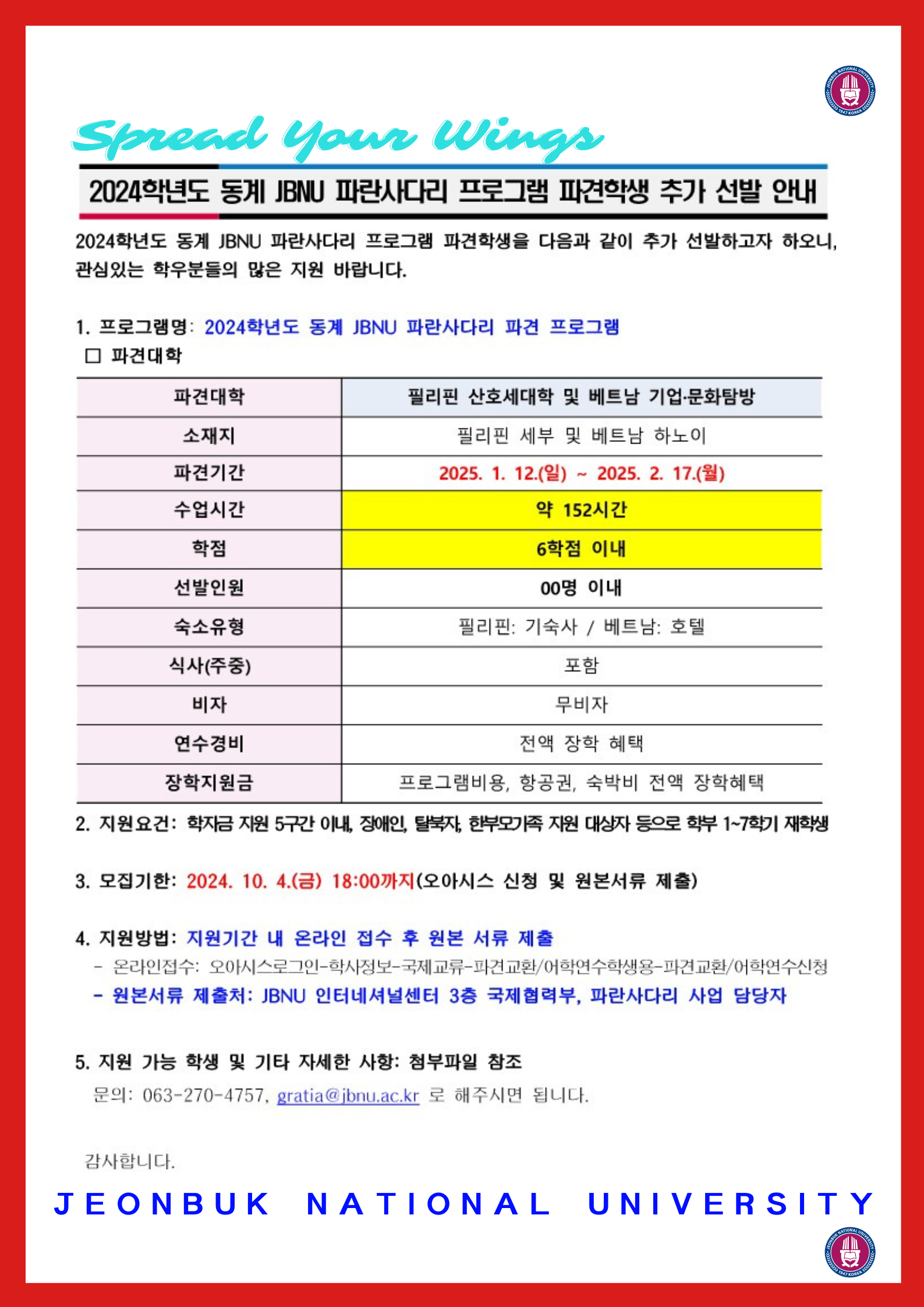 [D-2] [글로컬대학] [국제협력부] 2024 동계 JBNU파란사다리 해외 파견 프로그램 추가 선발 안내