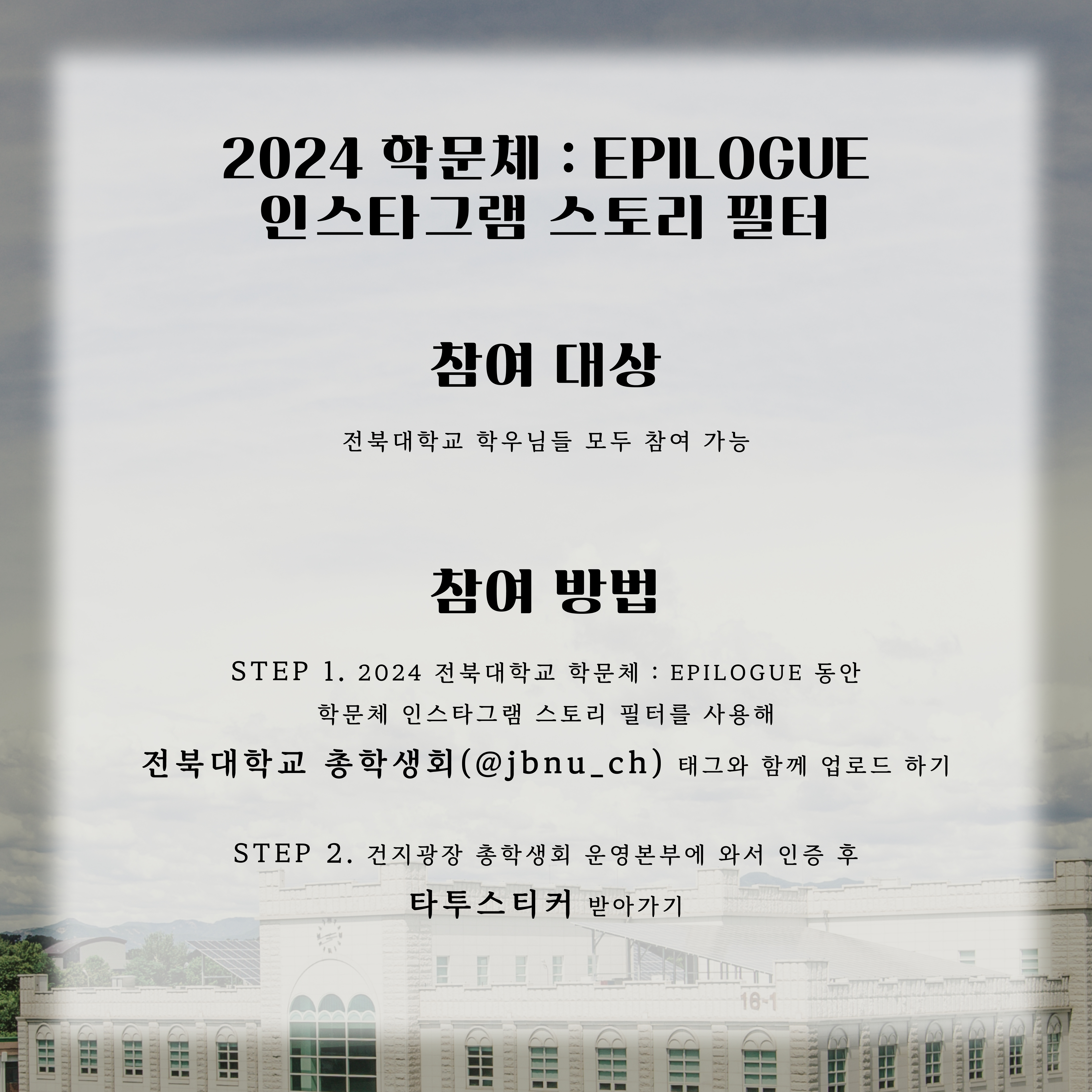 STEP 1. 2024 전북대학교 학문체 : EPILOGUE 동안 학문체 인스타그램 스토리 필터를 사용해 전북대학교 총학생회(@jbnu_ch) 태그와 함께 업로드 하기